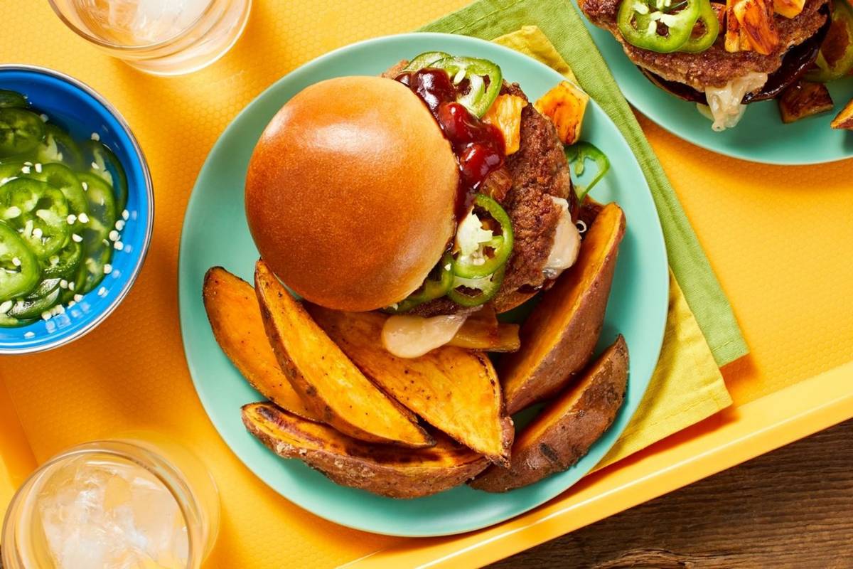 We love burgers for many a reason. Here are our top three: 1) satisfaction factor; 2) ooze effect; 3) major customization capabilities. We’re upping the burger ante here by stuffing pork patties (satisfying) with Monterey Jack (perfectly melty) and topping them with charred pineapple and quick-pickled jalapeño (DIY away!). Sweet potato fries and barbecue sauce join the party to make this dish number one.