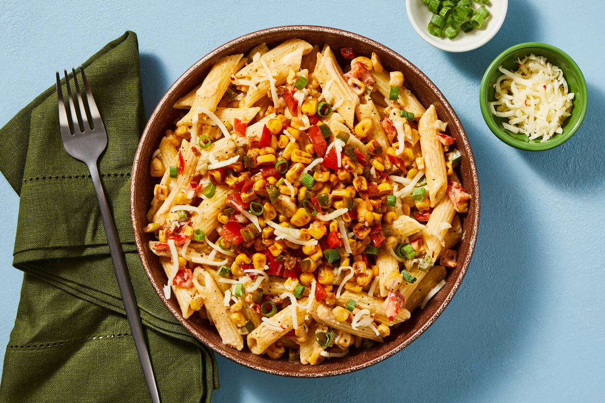 We've turned elote, the Mexican street corn snack that's traditionally made with lime juice, mayonnaise, chili powder, and Cojita cheese, into a filling dinner! Bell pepper, jalapeño, and fajita spices infuse this pasta with not-too-spicy chili flavor, while sweet corn and penne balance the heat. Then pasta is swirled with cream sauce, cream cheese, and pepper jack for a dreamy take on a traditional fave—right from the comfort of your own casa!