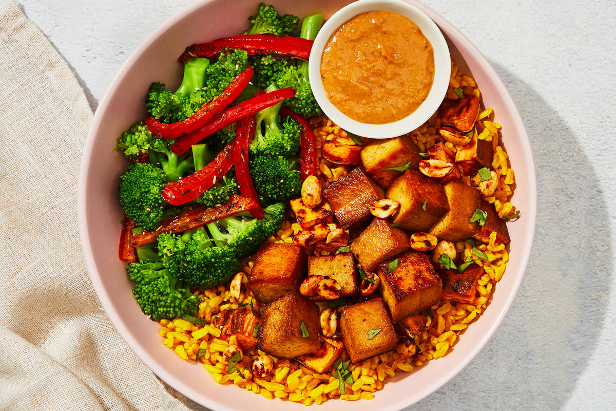 This hearty vegan curry draws on African cuisine with its deep peanutty flavors, garlic, toasted sesame seeds, tomatoes, and lime. It’s draped over curried brown basmati rice, tender sweet potatoes, and smoked tofu seasoned with roasted onion, chili powder, and cumin. It’s sprinkled with a spicy peanut topping and served with roasted broccoli and red bell peppers on the side.