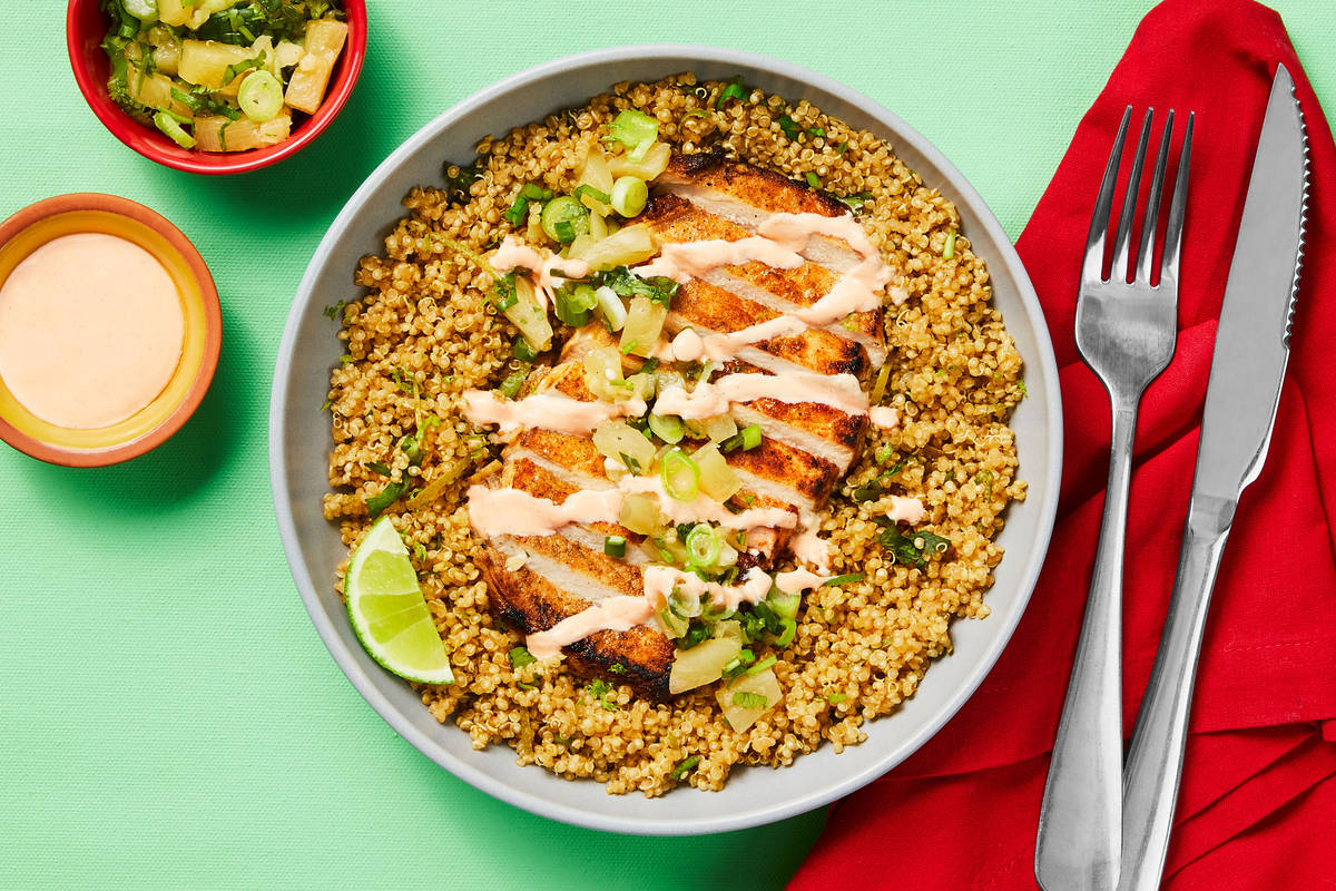 We can never get enough of sweet and savory combos for dinner, which is why we’re head-over-heels for al pastor. Traditionally, the dish features pineapple-marinated pork shoulder that’s spit-roasted until caramelized and meltingly tender. For this riff on the classic, we swap in pork chops, which we rub with Southwest spices, then sear until juicy. The pineapple actually makes not one, but two appearances: The juice is simmered with rich spices and lime to form a tantalizing pan sauce, while the fruit is chopped and stirred into salsa. It’s all served with zesty quinoa and a dollop of smoky red pepper crema.