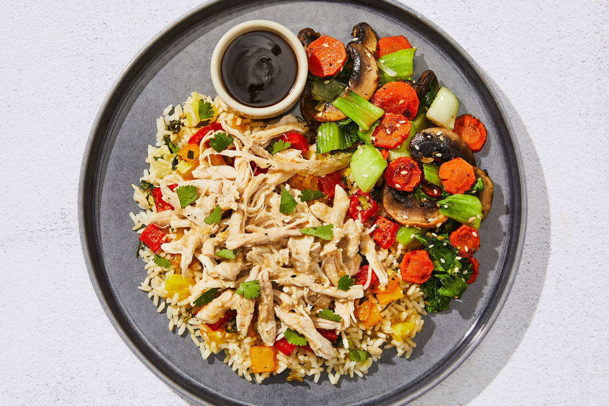 Ingredients: Boneless Skinless Chicken Thighs, Water, Bok Choy, Carrots, Mushrooms, Long Grain And Wild Rice Blend (Long Grain Parboiled Rice (Enriched With Iron (Ferric Orthophosphate), Niacin, Thiamine Mononitrate, Folic Acid), Wild Rice), Red Bell Peppers, Pineapple, Pineapple Juice (Pineapple Juice From Concentrate (Water, Pineapple Juice Concentrate), Ascorbic Acid (Vitamin C)), Yellow Bell Peppers, Tamari (Water, Soybeans, Salt, Alcohol (To Preserve Freshness), Lactic Acid, Rice Vinegar), Coconut Sugar, Olive Pomace Oil (Refined Olive Pomace Oil, Extra Virgin Olive Oil), Unsalted Butter (Pasteurized Cream, Natural Flavorings), Coconut Aminos (Coconut Nectar, Coconut Blossom Sap, Sea Salt), Rice Vinegar, Garlic, Date Paste, Toasted Sesame Oil, Green Onions, Green Onion, Honey, Ginger, Toasted Onion Powder, Sea Salt, Cornstarch, Roasted Sesame Seeds, Cilantro, Basil, Toasted Garlic Powder, Lime Juice (Water, Lime Juice From Concentrate), Ground Ginger, Black Garlic, Balsamic Vinegar (Wine Vinegar, Concentrated Grape Must, Cooked Grape Must, Caramel Coloring, Sulfites), Toasted Garlic, Sesame Seeds, Tapioca Starch, Granulated Green Onion, Porcini Mushroom Powder, Granulated Onion, Gochugaru Chile Flakes, White Pepper, Black Sesame Seeds The nutrition facts are based off of the recommended serving size. Serving Size = 1 Tray (374g)
