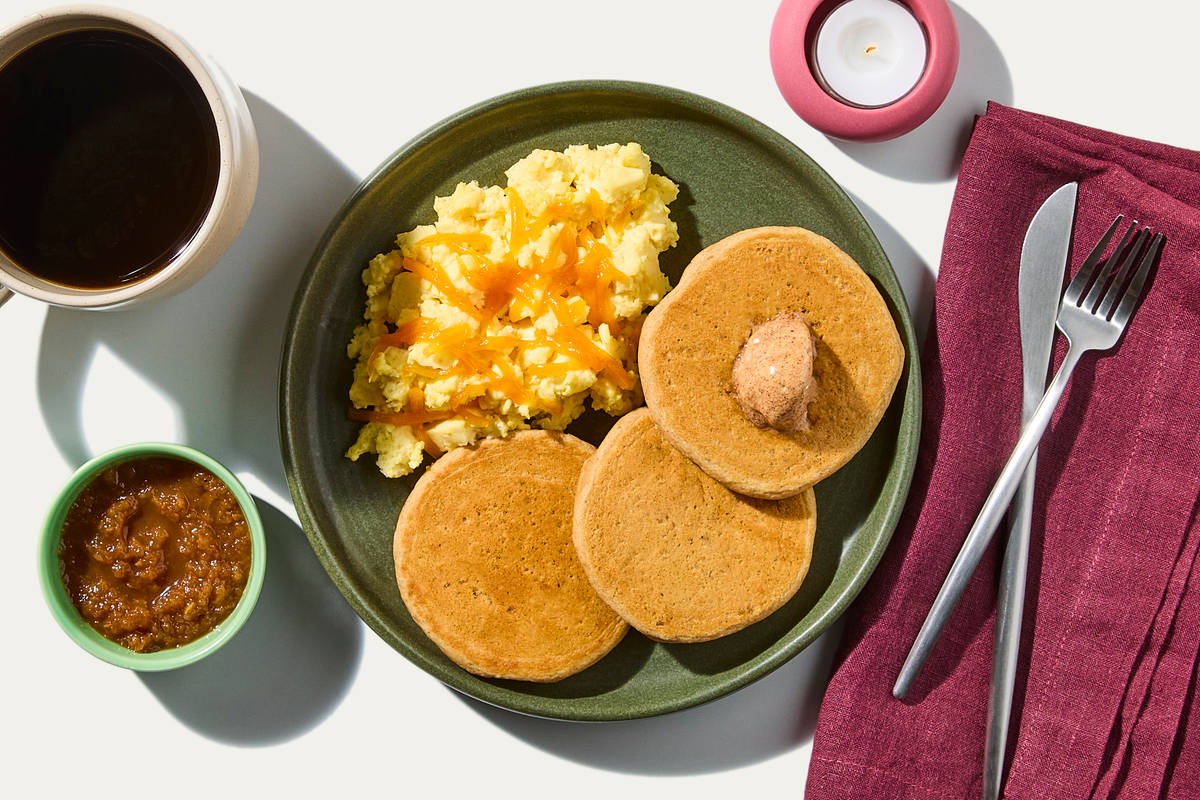 Start your day with a sweet and satisfying pancake breakfast from Factor! Our delicious apple cinnamon pancakes are made with almond flour, coconut sugar, freeze-dried apples, and buttermilk. A dollop of cinnamon butter melts over the top, and a sweet apple compote is served on the side. For extra protein to fuel your day, there’s also a helping of creamy cheddar scrambled eggs. Ingredients: Liquid Whole Eggs (Whole Eggs, Citric Acid, 0.15% Water Added As Carrier For Citric Acid. Citric Acid To Preserve Color), Liquid Egg Whites (Egg Whites, Guar Gum, Triethyl Citrate (Added As Whipping Aids)), Gluten Free Flour Blend (Sweet White Rice Flour, Whole Grain Brown Rice Flour, Potato Starch, Whole Grain Sweet White Sorghum Flour, Tapioca Flour, Xanthan Gum), Whole Milk (Pasteurized Milk, Vitamin D3), Lowfat Buttermilk (Cultured Lowfat Milk, Nonfat Milk, Sodium Citrate, Vitamin A Palmitate, Salt, Natural Flavor, Vitamin D3), Shredded Sharp Cheddar Cheese (Pasteurized Milk, Cheese Cultures, Salt, Enzymes, Annatto (Vegetable Color), Anti-Caking Agents (Potato Starch, Powdered Cellulose), Natamycin (A Natural Mold Inhibitor)), Apples, Apple Cider (Apple Cider And Ascorbic Acid (Vitamin C)), Unsalted Butter (Pasteurized Cream, Natural Flavorings), Cream Cheese (Pasteurized Milk And Cream, Salt, Cheese Culture, Stabilizers (Xanthan Gum, Carob Bean Gum, Guar Gum)), Blanched Almond Flour, Olive Pomace Oil (Refined Olive Pomace Oil, Extra Virgin Olive Oil), Coconut Sugar, Heavy Cream (Heavy Cream, Milk, Gellan Gum, Sunflower Lecithin), Date Syrup (Dates, Water), Maple Syrup, Vinegar, Vanilla Extract (Vanilla Bean Extractives In Water And Alcohol), Freeze-Dried Apples (Apples, Salt, Citric Acid, Ascorbic Acid), Baking Powder (Sodium Acid Pyrophosphate, Sodium Bicarbonate, Corn Starch, Sodium Aluminum Sulfate, Monocalcium Phosphate, Silicon Dioxide), Apple Pie Spice (Cinnamon, Nutmeg, Cloves), Lemon Juice, Cinnamon, Sea Salt, Baking Soda The nutrition facts are based off of the recommended serving size. Serving Size = 1 Tray (326g)
