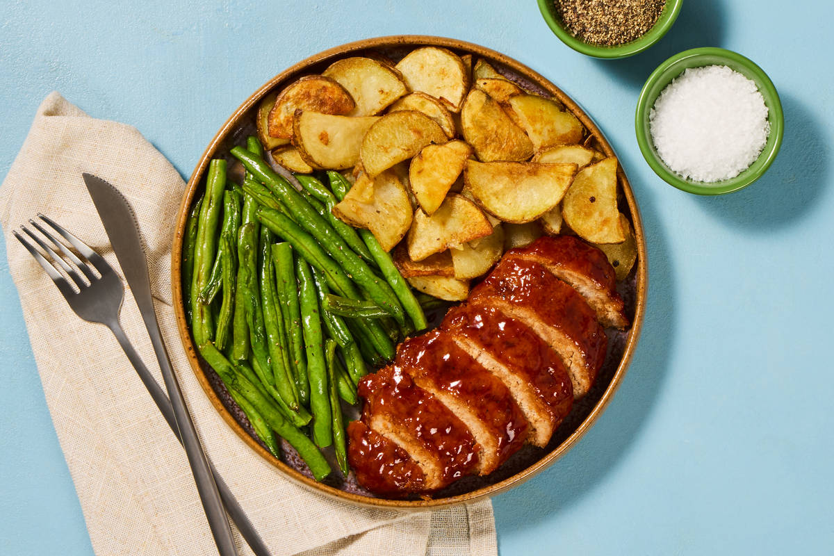 Classic meatloaf gets a flavorful twist in this weeknight crowd-pleaser. Juicy pork meatloaves are roasted with a sweet and savory glaze made with apricot jam, BBQ sauce, and ketchup, and served with tender green beans and garlicky potatoes. Bonus: This simple sheet pan supper is as easy to clean up as it is to make!