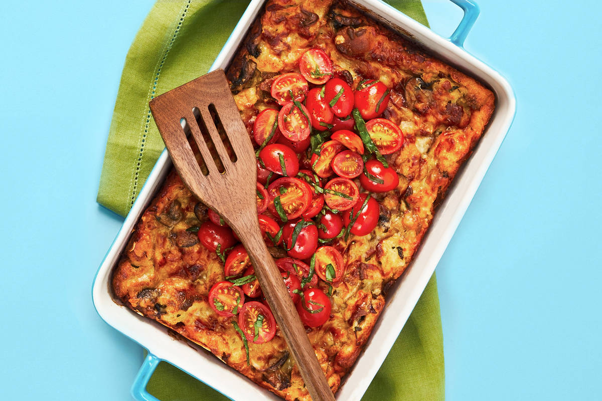 While strata bakes, halve tomatoes. Thinly slice reserved basil leaves. Toss tomatoes and sliced basil in a small bowl with a drizzle of olive oil; season with salt and pepper. Scatter tomato basil topping over strata. (For picky eaters, serve topping on the side.)