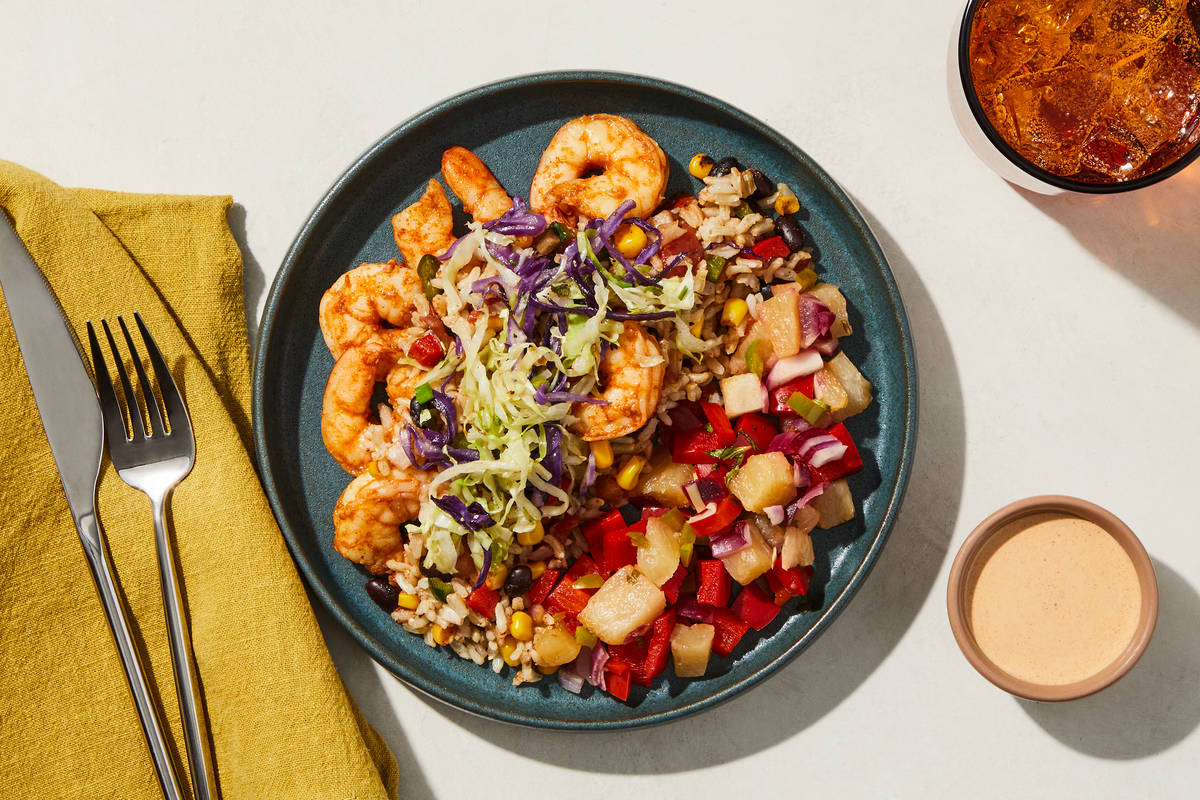 For this tortilla-free spin on beachside Baja-style tacos, we marinate shrimp in garlic, ancho, cumin, and orange juice. They’re roasted until juicy and served with fire-roasted tomato, corn, and black bean rice, and topped with garlic-cilantro-roasted cabbage. On the side is a sweet roasted pineapple salsa and chipotle-lime crema for drizzling or dipping. **Ingredients:** Shrimp (Shrimp, Water, Salt), Pineapple, Water, Sour Cream (Cultured Cream), Green Cabbage, Red Bell Peppers, Brown Jasmine Rice, Black Beans, Yellow Sweet Corn, Red Onions, Roasted Corn, Fire Roasted Tomatoes (Tomatoes, Tomato Juice, Sea Salt, Calcium Chloride, Citric Acid), Red Cabbage, Olive Pomace Oil (Refined Olive Pomace Oil, Extra Virgin Olive Oil), Cilantro, Garlic, Poblano Peppers, Lime Juice (Water, Lime Juice From Concentrate), Jalapeño Peppers, Vinegar, Green Onions, Roasted Garlic Oil (Olive Pomace Oil (Refined Olive Pomace Oil, Extra Virgin Olive Oil) Garlic), Sea Salt, Cumin, Ancho Chile Powder, Granulated Onion, Orange Juice, Granulated Garlic, Smoked Paprika, Toasted Garlic Powder, Coriander, Black Pepper, Tajin Seasoning (Chili Peppers, Sea Salt, Dehydrated Lime Juice, Silicon Dioxide (To Prevent Caking)), Chipotle Chili Pepper (Less Than 2% Silicon Dioxide Added To Prevent Caking), Lime Powder (Citric Acid, Natural Lime Flavor), Chili Powder (Chili Pepper, Spices (Including Mustard), Salt, Garlic Powder), Paprika (Paprika And Silicon Dioxide (Added To Make Free Flowing)), Smoked Black Pepper (Pepper, Smoke Flavor) The nutrition facts are based off of the recommended serving size. Serving Size = 1 Tray (337g)