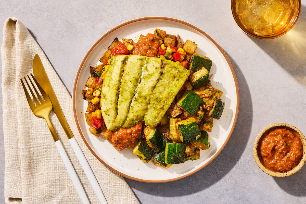 In this Tex-Mex style dinner, the layers of bold flavor start with a bed of roasted Mexican-seasoned potatoes topped with a fire-roasted tomato salsa, and then a layer of chunky corn salsa packed with bell peppers, poblanos, and red onions. Next is a flaky barramundi fillet marinated in cilantro, lime, and garlic with a side of cumin-roasted zucchini. The final element is a cilantro crema to drizzle over all. Ingredients: Barramundi, Zucchini, Sweet Potatoes (Sweet Potatoes, Sodium Metabisulfite (Added To Maintain Color)), Fire Roasted Tomatoes (Tomatoes, Tomato Juice, Sea Salt, Calcium Chloride, Citric Acid), Onions, Corn, Olive Pomace Oil (Refined Olive Pomace Oil, Extra Virgin Olive Oil), Roasted Corn, Fire Roasted Tomatoes (Tomatoes, Tomato Juice, Sea Salt, Calcium Chloride, Citric Acid), Cilantro, Garlic, Jalapeño Peppers, Lime Juice (Water, Lime Juice From Concentrate), Water, Red Bell Peppers, Poblano Peppers, Red Onion, Lemon Juice, Cumin, Ancho Chile Powder, Smoked Paprika, Granulated Onion, Tomato Paste (Tomatoes, Citric Acid), Orange Juice, Guajillo Chile Powder, Sea Salt, Green Onions, Coriander, Smoked Black Pepper (Pepper, Smoke Flavor), Dried Oregano, Granulated Green Onion The nutrition facts are based off of the recommended serving size. Serving Size = 1 Tray (374g)