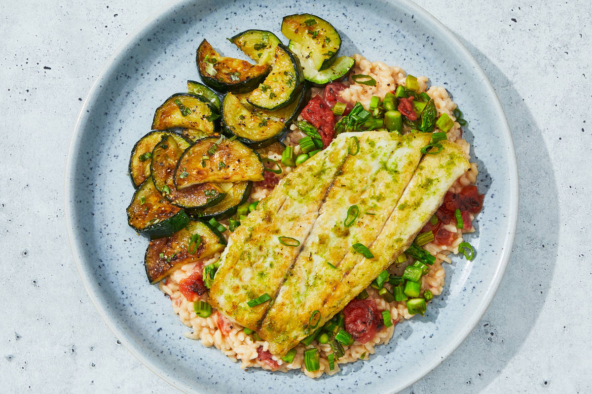 This Italian-inspired dish begins with creamy risotto folded with fire-roasted tomatoes for savory flavor. It’s topped with a basil-marinated barramundi fillet and roasted asparagus, then finished with a spoonful of tomato salsa. On the side, enjoy toasted garlic zucchini with chive butter. Ingredients: Barramundi, Zucchini, Water, Fire Roasted Tomatoes (Tomatoes, Tomato Juice, Sea Salt, Calcium Chloride, Citric Acid), Asparagus, Arborio Rice, Olive Pomace Oil (Refined Olive Pomace Oil, Extra Virgin Olive Oil), Tomatoes, Unsalted Butter (Pasteurized Cream, Natural Flavorings), Chardonnay Wine (Grapes, Sulfites), Garlic, Grated Parmesan Cheese (Imported Parmesan Cheese (Pasteurized Cow'S Milk, Cheese Culture, Salt, Enzymes), Water, Milk Protein, Palm Oil Blend, Disodium Phosphate, Citric Acid, Xanthan Gum, Powdered Cellulose (Anti-Caking Agent), Calcium Propionate (Preservative)), Onions, Basil, Vinegar, Sea Salt, Green Onions, Brown Chicken Stock (Chicken Stock, Mirepoix Stock (Made Of Carrot, Celery And Onion Stocks), Salt, Gelatin, White Wine), Toasted Garlic, Lemon Juice, Black Pepper, Dried Chives, Granulated Garlic, Dried Oregano, Smoked Black Pepper (Pepper, Smoke Flavor) The nutrition facts are based off of the recommended serving size. Serving Size = 1 Tray (374g)