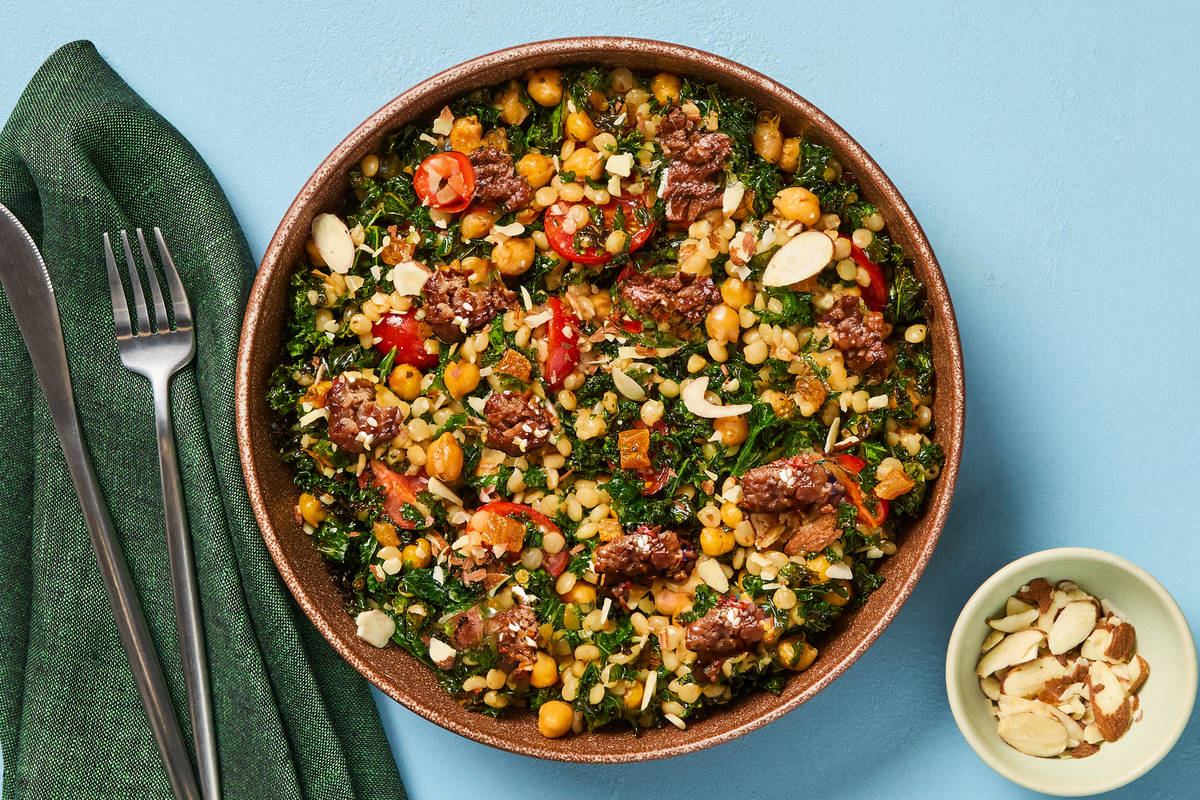 Buckle up, buttercup, because this sweetly savory power bowl is a brawny one! We present a veritable one-bowl feast that’s bursting with flavors and textures. The base is savory, springy couscous cooked in rich vegetable stock and topped with garlicky roasted kale and crispy chickpeas tossed with juicy grape tomatoes and chewy dried apricots in a tangy-sweet pepper jam vinaigrette. After a shower of sliced almonds for crunchy contrast, your bowl is ready to power you up for all your earthly pursuits.