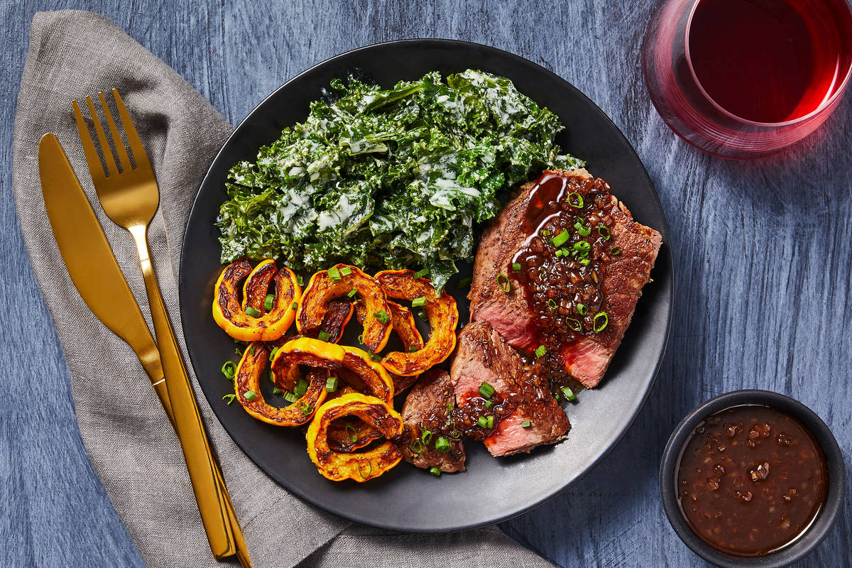 Beef tenderloin is ultra-special. True to its name, this cut is luxuriously tender—perfect for impressing your dinner companion (and yourself). Here, it’s seared to develop a deep brown crust and then drizzled with a rich, shallot-flecked pan sauce. Like any great steak-centric meal, this dish doesn’t skimp on the sides. Sweet roasted delicata squash are the perfect accompaniment for creamy, garlicky kale—together, they add a deliciously hearty bite.