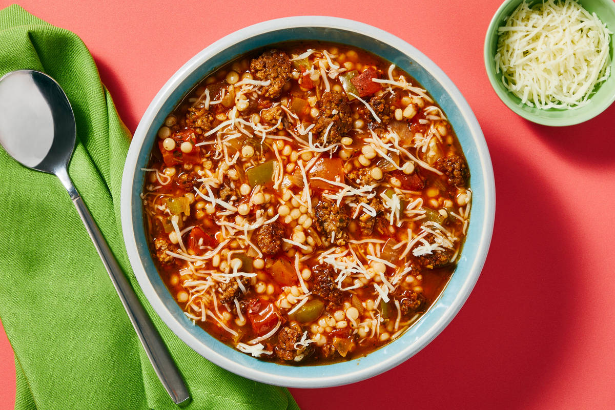 Our chefs have transformed everything you love about homestyle stuffed peppers into a comforting pot of soup that’s just right for those days you need a little extra coziness. You’ll begin by caramelizing onion and bell pepper, then stirring in tomato paste for an umami burst. Add in juicy browned ground beef and our peppery Tuscan spice blend, then stir in pearl couscous and simmer until tender, with all the flavors melded together. A final sprinkle of mozzarella just before serving melts and swirls into the soup for a simply irresistible meal worthy of your favorite bowl.