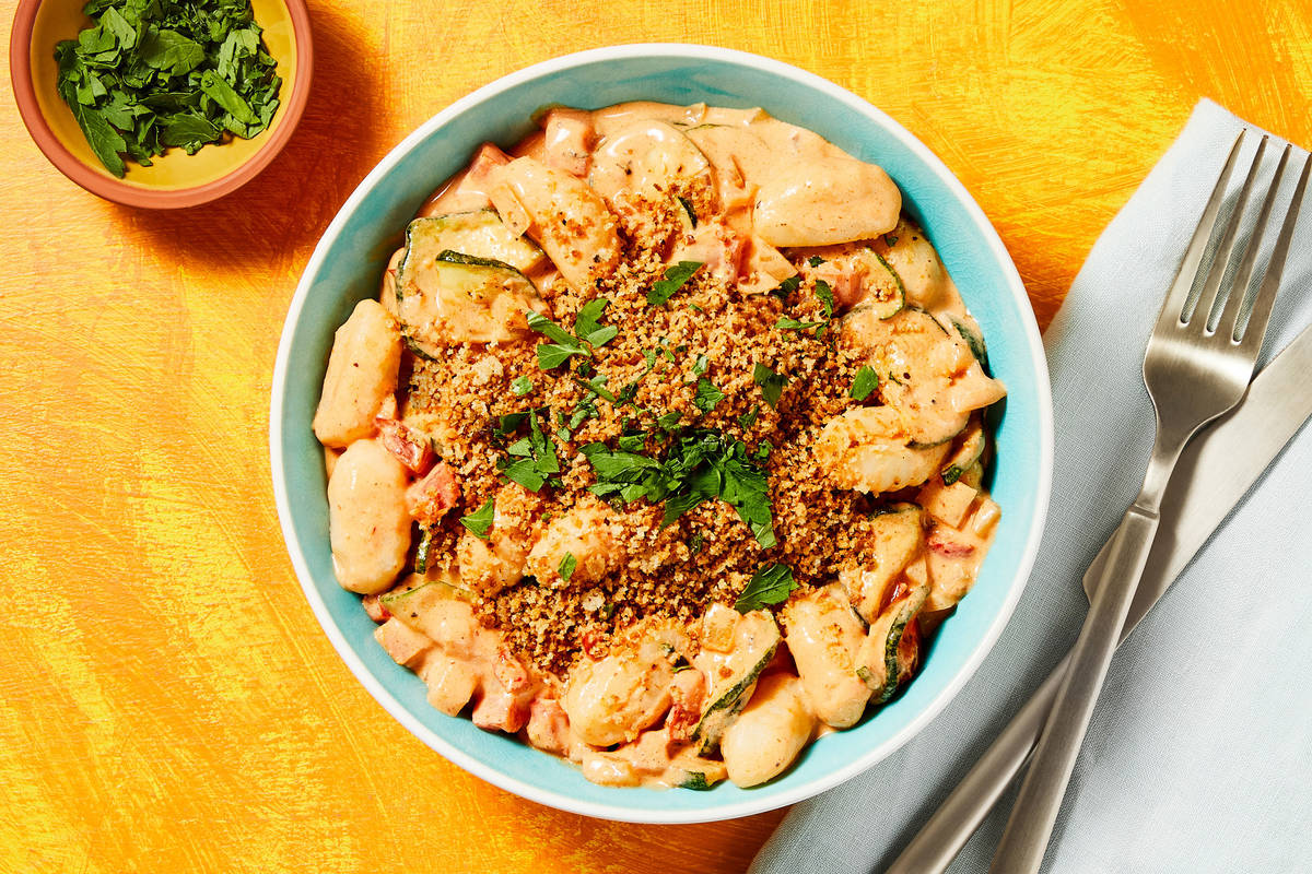 Raise your hand if you’re obsessed with anything gnocchi. (We've all raised our hands over here.) These little potato-based dumplings deliver an extra-tender, extra-carby bite, and here, they're paired with roasted bell pepper and zucchini, then tossed in a creamy tomato sauce. To top things off—in this case literally—there’s a layer of garlicky panko breadcrumbs. Once you take a bite, don’t be surprised when you find yourself making excuses to whip up the dish again and again!