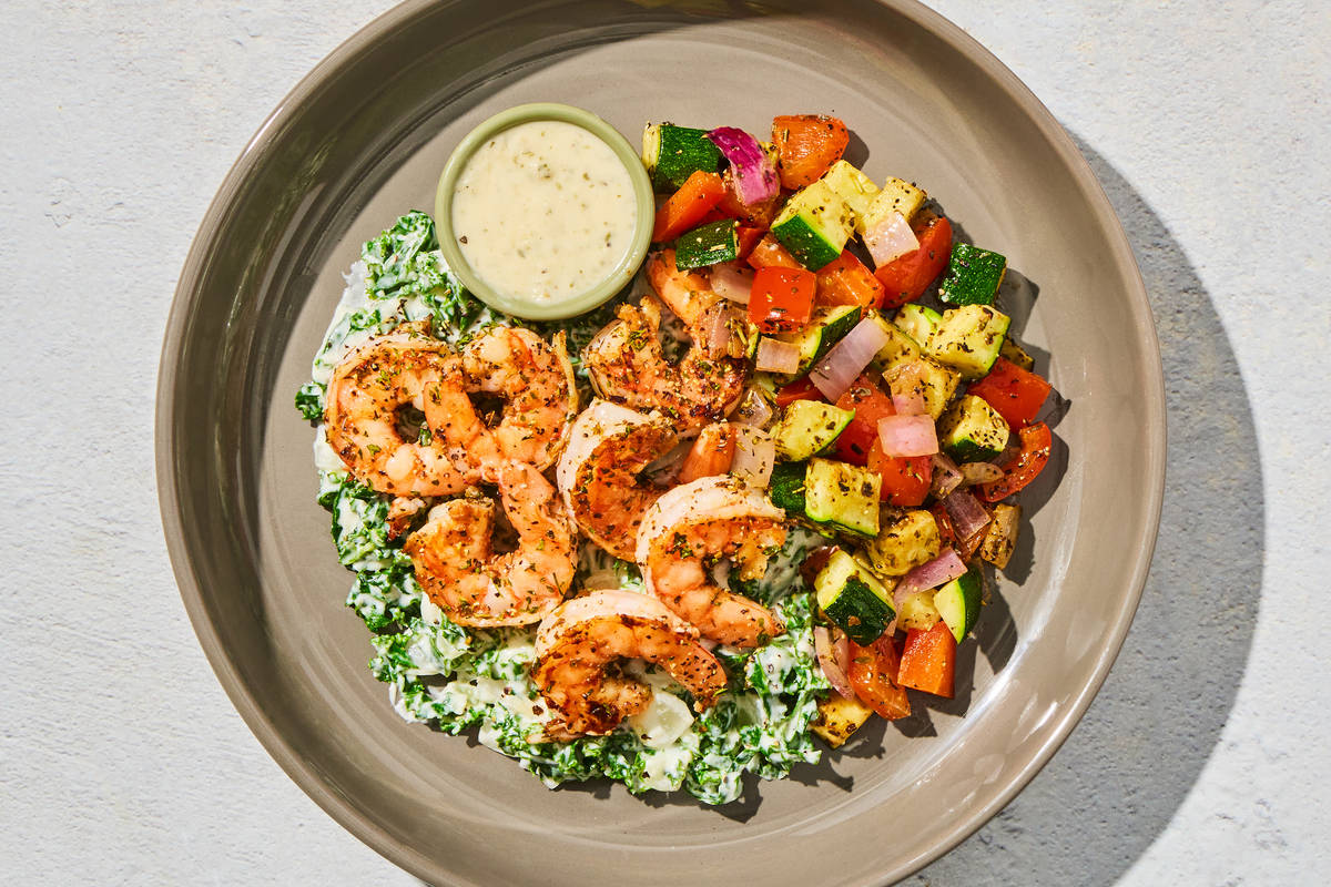 Our chefs have prepared a meal to remember with this ultra-luxe seafood dish. Succulent shrimp are marinated in garlic and savory Italian spices, and then roasted until tender and juicy. They’re drizzled with a rich onion-garlic butter sauce and served over a bed of creamy kale made with heavy cream, butter, and Parmesan. To balance out the richness of the main, a medley of roasted zucchini, red bell peppers, and red onion, seasoned with even more Italian spices, is served on the side. Ingredients: Shrimp (Shrimp, Water, Salt), Zucchini, Heavy Cream (Heavy Cream, Milk, Gellan Gum, Sunflower Lecithin), Unsalted Butter (Pasteurized Cream, Natural Flavorings), Kale, Water, Red Bell Peppers, Olive Pomace Oil (Refined Olive Pomace Oil, Extra Virgin Olive Oil), Red Onion, Whole Milk (Pasteurized Milk, Vitamin D3), Garlic, Onions, Grated Parmesan Cheese (Imported Parmesan Cheese (Pasteurized Cow'S Milk, Cheese Culture, Salt, Enzymes), Water, Milk Protein, Palm Oil Blend, Disodium Phosphate, Citric Acid, Xanthan Gum, Powdered Cellulose (Anti-Caking Agent), Calcium Propionate (Preservative)), Onions, Blanched Almond Flour, Fennel, Lemon Juice, Sea Salt, Seafood Stock Concentrate (White Wine, Lobster Stock, Fish Stock (Cod, Pollock), Salt, Shrimp Stock, Dried Shrimp Stock, Carrot Stock, Fish Gelatin (Tilapia), Mirepoix Stock (Made Of Carrot, Celery, And Onion Stocks), Dried Fish Stock, Tomato Paste, Dried Crab Stock), Tomato Powder (Tomato Powder, Silicon Dioxide (Anti-Caking Agent)), Ground Fennel, Toasted Garlic, Dried Oregano, Gochugaru Chile Flakes, Toasted Garlic Powder, Dried Basil, Granulated Garlic, Tomato Paste (Tomatoes, Citric Acid), Rosemary Powder, Black Pepper, Xanthan Gum, White Pepper, Cayenne Pepper, Dried Parsley The nutrition facts are based off of the recommended serving size. Serving Size = 1 Tray (309g)