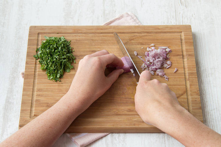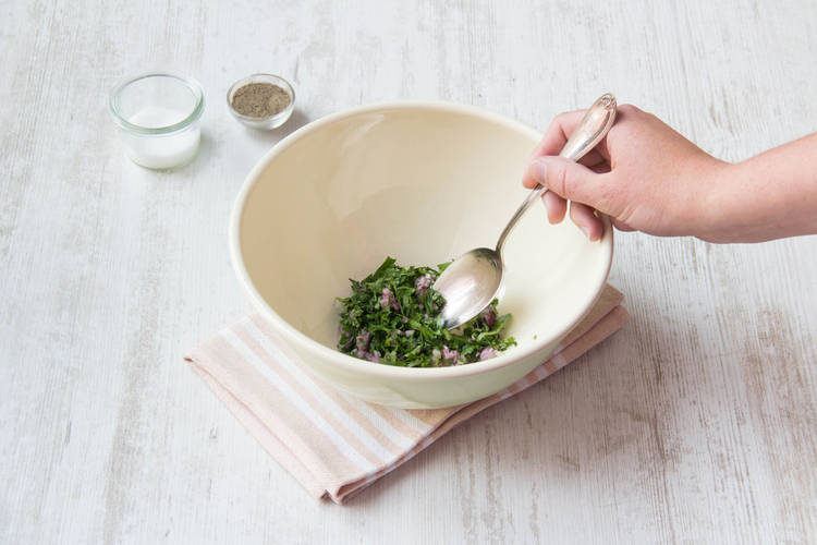 While the faro cooks drain and rinse the beans. Finely chop the cilantro. Halve, peel, and mince the shallot.