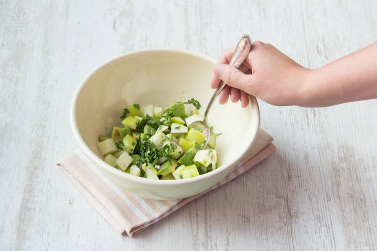 Halve, pit, and dice the avocado. Cut the apple into ½-inch cubes, discarding the apple core. Toss the apple into the vinaigrette.