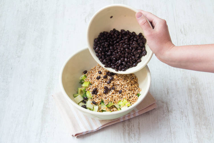 When the farro is ready, toss it into the vinaigrette along with the black beans. Season with salt and pepper.