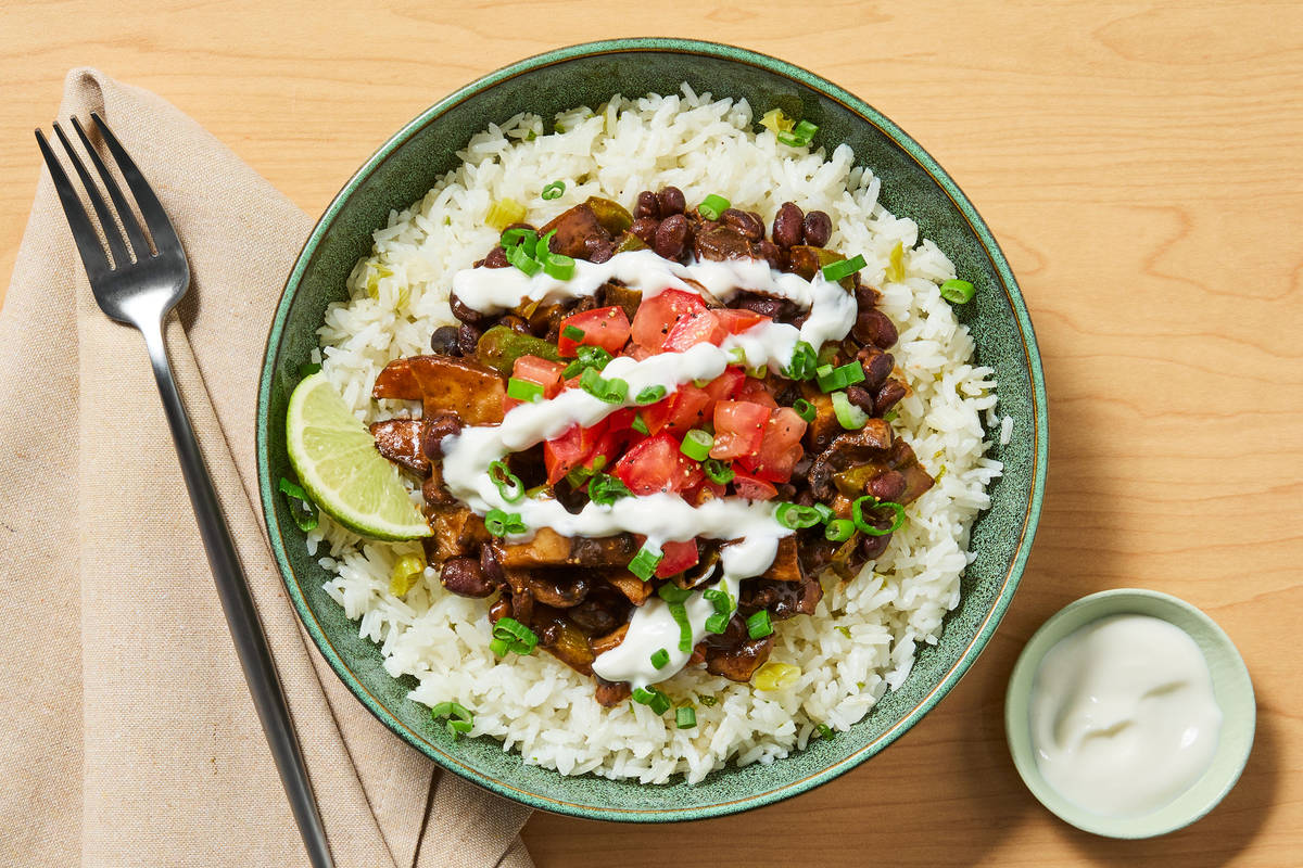 Build the perfect burrito bowl in your very own kitchen, starring slow-simmered spiced black beans and a savory duo of oven-roasted green pepper and portobello mushrooms. Serve this hearty vegetarian trio over a bed of fluffy lime-cilantro rice, and top with zesty homemade pico de gallo and a drizzle of tangy lime crema.