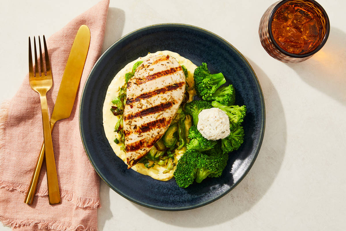 For maximum flavor, our chefs gave this chicken breast the royal treatment. They brined it to achieve perfectly consistent seasoning, dusted it with fragrant sage and cracked pepper, and grilled it for a touch of delicious char. The chicken breast is served over roasted Brussels sprouts made irresistibly cheesy with the addition of smoky gouda and cheddar fondue. Broccoli florets with a dollop of parsley cream cheese round out the meal. **Ingredients:** Boneless Chicken Breast With Rib Meat, Broccoli, Brussels Sprouts, Cream Cheese (Pasteurized Milk And Cream, Salt, Cheese Culture, Stabilizers (Xanthan Gum, Carob Bean Gum, Guar Gum)), Heavy Cream (Heavy Cream, Milk, Gellan Gum, Sunflower Lecithin), Olive Pomace Oil (Refined Olive Pomace Oil, Extra Virgin Olive Oil), Shredded White Cheddar Cheese (Pasteurized Milk, Cheese Cultures, Salt, Enzymes, Anti-Caking Agents (Potato Starch, Powdered Cellulose, Natamycin (A Natural Mold Inhibitor))), Shredded Smoked Gouda Cheese (Pasteurized Milk, Water, Cheese Cultures, Skim Milk, Salt, Enzymes, Sodium Phosphate, Calcium Propionate (Preservative), Apocarotenal (For Color)), Powdered Cellulose (To Prevent Caking), Natamycin (A Natural Mold Inhibitor)), Poblano Peppers, Water, Onions, Garlic, Vinegar, Whole Milk (Pasteurized Milk, Vitamin D3), Green Onions, Red Wine Vinegar (Diluted With Water To 5% Acidity), Sea Salt, Dried Parsley, Dried Chives, Granulated Garlic, Smoked Black Pepper (Pepper, Smoke Flavor), Black Pepper The nutrition facts are based off of the recommended serving size. Serving Size = 1 Tray (298g)