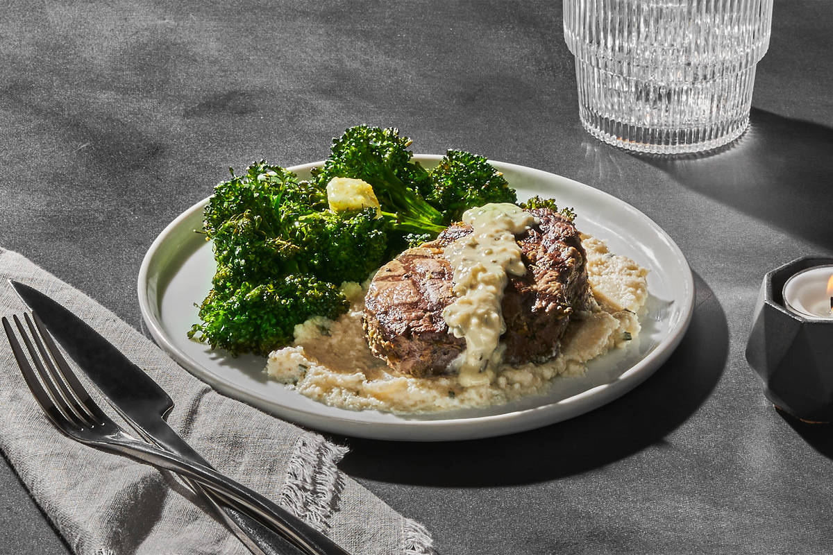 Our premium filet is marinated in roasted garlic, lemon juice, green onions, black pepper, and a pinch of rosemary. Then, we expertly grill the steak to medium perfection and serve it over a rich and creamy celery root and cauliflower mash enriched with cream cheese and sour cream. We top it off with a dollop of whipped chive and blue cheese cream. On the side, roasted Broccolini topped with toasted garlic butter offers a punch of savory flavor. Ingredients: Beef Tenderloin, Broccolini, Riced Cauliflower, Celery Root, Olive Pomace Oil (Refined Olive Pomace Oil, Extra Virgin Olive Oil), Blue Cheese (Blue Cheese (Pasteurized Milk, Cheese Culture, Salt, Enzymes, Penicillium Roqueforti), Powdered Cellulose (Added To Prevent Caking), Natamycin (A Natural Mold Inhibitor)), Heavy Cream (Heavy Cream, Milk, Gellan Gum, Sunflower Lecithin), Whole Milk (Pasteurized Milk, Vitamin D3), Sour Cream (Cultured Cream), Unsalted Butter (Pasteurized Cream, Natural Flavorings), Cream Cheese (Pasteurized Milk And Cream, Salt, Cheese Culture, Stabilizers (Xanthan Gum, Carob Bean Gum, Guar Gum)), Water, Vinegar, Green Onions, Sea Salt, Toasted Garlic, Dried Chives, Smoked Black Pepper (Pepper, Smoke Flavor), Dried Onion Flakes, Toasted Onion Powder, Toasted Garlic Powder, Garlic, Rosemary, Lemon Juice The nutrition facts are based off of the recommended serving size. Serving Size = 1 Tray (357g)
