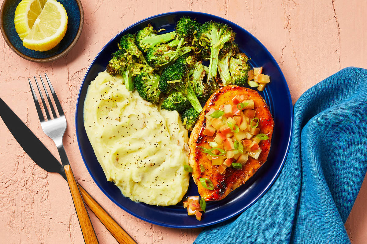 Winner, winner, chicken dinner! Chicken cutlets are satisfying, speedy, and oh-so versatile, which is why our chefs are always thinking up new ways to take them to the next level. This week, they amped up the flavors… big time! Sweet and savory is the name of the game here. Coated in brown sugar bourbon spice, these cutlets are seared and topped with a buttery apple pan sauce. Zesty broccoli and garlic mashed potatoes pair perfectly with the main event. Prepare yourself for a flavor explosion.