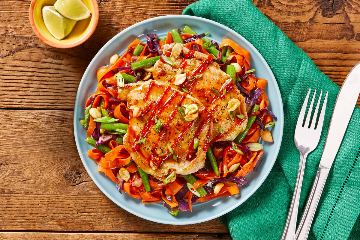 Falling into a stir-fry rut with the same meat, veggie, and sauce combo each week? We’ve got you covered. This version stars green beans, cabbage, and carrots, which are sautéed with scallions, then simmered in a sweet, savory, and tangy soy glaze. More of that glossy, swoon-worthy sauce simmers with seared pork cutlets, which are served over top. It’s all garnished with candied peanuts for satisfying crunch and drizzled with sriracha for customizable heat. Dinner winner? We think so.