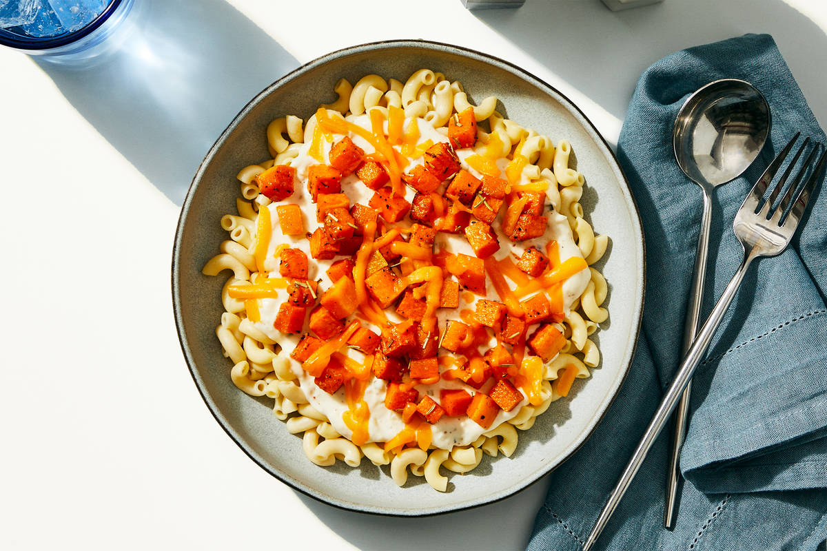 This mac ’n’ cheese features classic comfort with a sweet and smoky seasonal spin. Al dente elbow macaroni is draped in a creamy smoked gouda and white cheddar sauce, then topped with diced herb-roasted butternut squash and a generous sprinkle of sharp cheddar cheese. **Ingredients:** Brown Rice Elbow Macaroni (Water, Brown Rice Flour, Potato Starch, Tapioca Starch, Whole Egg, Egg White, Xanthan Gum, Salt), Butternut Squash, Cream Cheese (Pasteurized Milk And Cream, Salt, Cheese Culture, Stabilizers (Xanthan Gum, Carob Bean Gum, Guar Gum)), Heavy Cream (Heavy Cream, Milk, Gellan Gum, Sunflower Lecithin), Shredded Smoked Gouda Cheese (Pasteurized Milk, Water, Cheese Cultures, Skim Milk, Salt, Enzymes, Sodium Phosphate, Calcium Propionate (Preservative), Apocarotenal (For Color), Powdered Cellulose (To Prevent Caking), Natamycin (A Natural Mold Inhibitor)), Shredded Sharp Cheddar Cheese (Pasteurized Milk, Cheese Cultures, Salt, Enzymes, Annatto (Vegetable Color), Anti-Caking Agents (Potato Starch, Powdered Cellulose), Natamycin (A Natural Mold Inhibitor)), Whole Milk (Pasteurized Milk, Vitamin D3), Onions, Shredded White Cheddar Cheese (Pasteurized Milk, Cheese Cultures, Salt, Enzymes, Anti-Caking Agents (Potato Starch, Powdered Cellulose, Natamycin (A Natural Mold Inhibitor))), Olive Pomace Oil (Refined Olive Pomace Oil, Extra Virgin Olive Oil), Roasted Garlic Oil (Olive Pomace Oil (Refined Olive Pomace Oil, Extra Virgin Olive Oil) Garlic), Garlic, Dried Chives, Sea Salt, Toasted Onion Powder, Smoked Black Pepper (Pepper, Smoke Flavor), Rosemary, Rubbed Sage The nutrition facts are based off of the recommended serving size. Serving Size = 1 Cup (121g)