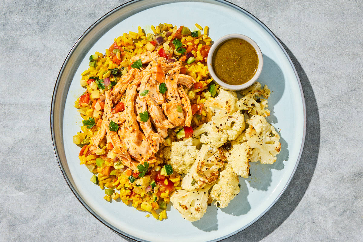 Ingredients: Cauliflower, Boneless Skinless Chicken Thighs, Water, Yellow Squash, Brown Jasmine Rice, Garlic, Carrots, Green Bell Peppers, Onions, Grape Tomatoes, Tomatoes, Cilantro, Fire Roasted Red Peppers (Roasted Peppers, Water, Salt, Citric Acid, Calcium Chloride), Olive Pomace Oil (Refined Olive Pomace Oil, Extra Virgin Olive Oil), Tomato Sauce (Fresh Vine-Ripened California Tomatoes, Salt, Red Pepper, Dehydrated Onion, Dehydrated Garlic, Spice Extractive, Citric Acid, Tomatoes, Less Than 2% Of The Following: Salt, Onion Powder, Garlic Powder, Natural Flavors), Sherry Vinegar, Red Onions, Vinegar, Roasted Garlic Oil (Olive Pomace Oil (Refined Olive Pomace Oil, Extra Virgin Olive Oil) Garlic), Jalapeño Peppers, Sea Salt, Lemon Juice, Brown Chicken Stock (Chicken Stock, Mirepoix Stock (Made Of Carrot, Celery, And Onion Stocks), Salt, Bovine Gelatin, White Wine, Carrot Juice Concentrate, Yeast Extract, Celery Juice Concentrate, Onion Powder, White Wine (Sulfites), Natural Flavors), Granulated Garlic, Granulated Onion, Dried Chives, Cumin, Smoked Paprika, Black Pepper, Turmeric, Toasted Garlic Powder, Paprika (Paprika And Silicon Dioxide (Added To Make Free Flowing)), Liquid Smoke (Water, Hickory Smoke Concentrate), Smoked Black Pepper (Pepper, Smoke Flavor), Dried Oregano, Crushed Red Pepper Flakes The nutrition facts are based off of the recommended serving size. Serving Size = 1 Tray (388g)