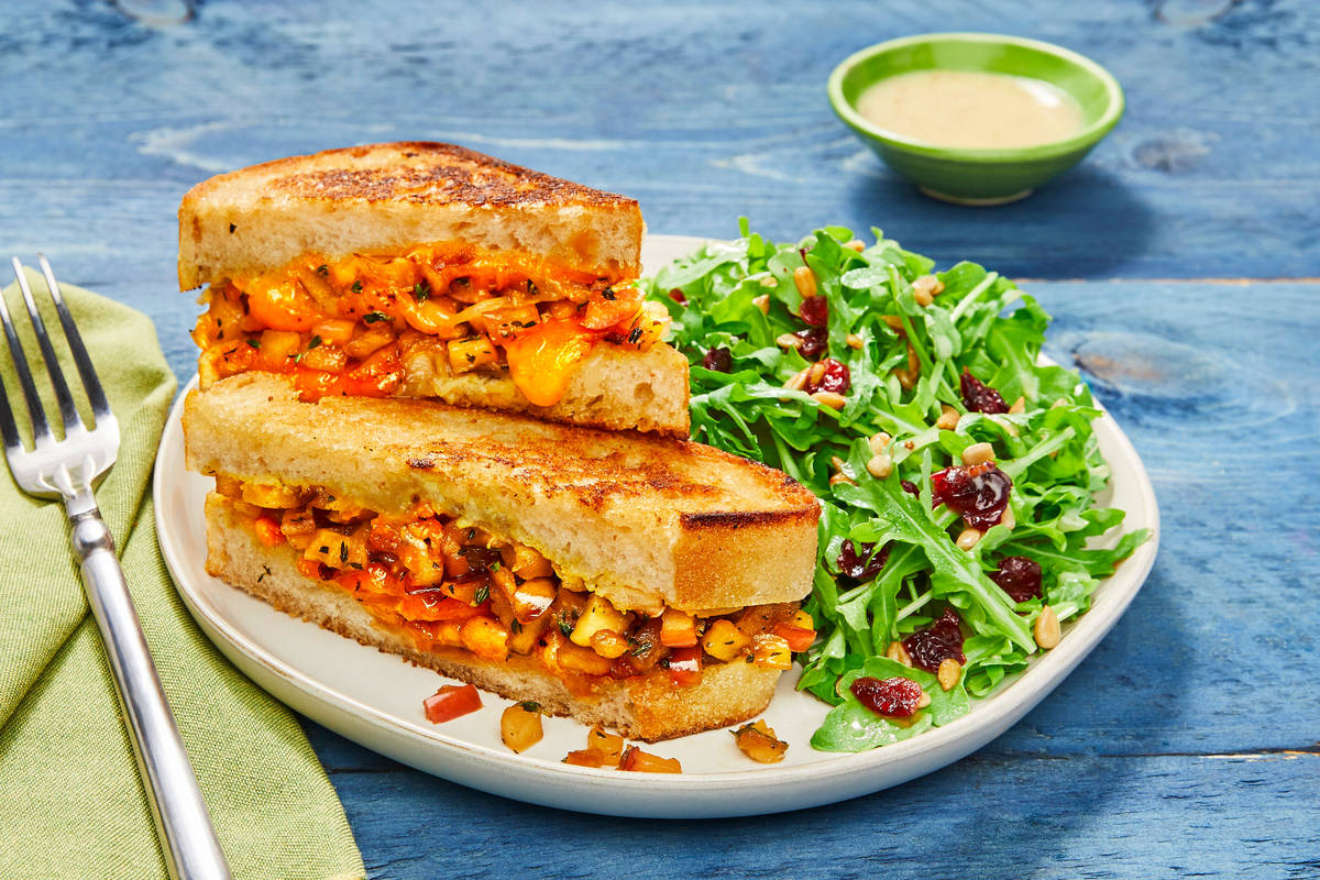 Sure, a classic white bread and American cheese melt hits the spot every now and then—but try one bite of this sweet and savory sandwich, and you just might want to add it to your weeknight repertoire. Sourdough bread slices are swiped with Dijon mustard, then layered with white and yellow cheddar and a caramelized apple filling. They’re griddled in butter until perfectly golden brown and melty and paired with arugula, dried cranberries, and sunflower seeds tossed in a tangy Honey Dijon Dressing.