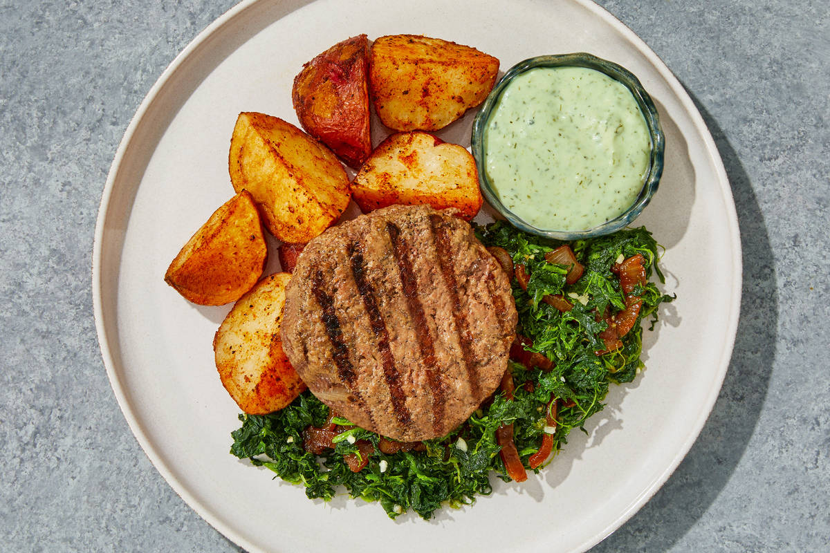 Our extra-juicy seasoned beef patty is smothered with caramelized onions and sits atop a bed of roasted garlic spinach. It’s all draped in a velvety Gournay cheese sauce swirled with chives, thyme, and parsley. It’s served with a side of roasted red potato wedges dusted with smoked paprika.