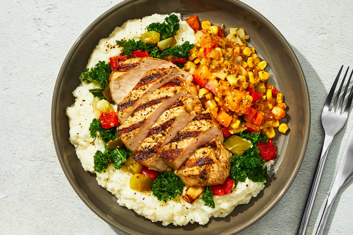 Ingredients: Pork Chop, Onions, Reduced Fat Milk (Pasteurized Reduced Fat Milk, Vitamin A Palmitate, Vitamin D3), Tomatillos, Yellow Sweet Corn, Tomatoes, Red Bell Peppers, Kale, Green Bell Peppers, Celery, Olive Pomace Oil (Refined Olive Pomace Oil, Extra Virgin Olive Oil), White Corn Grits (Degerminated White Corn Grits, Niacinamide, Reduced Iron, Thiamin Mononitrate, Riboflavin, Folic Acid), Water, Garlic, Unsalted Butter (Pasteurized Cream, Natural Flavorings), Cream Cheese (Pasteurized Milk And Cream, Salt, Cheese Culture, Stabilizers (Xanthan Gum, Carob Bean Gum, Guar Gum)), Shredded Smoked Cheddar Cheese ((Cultured Pasteurized Milk, Salt, Enzymes, Color Added), Powdered Cellulose (Anti-Caking Agent)), Vinegar, Apple Cider Vinegar (Diluted With Water To 5% Acidity), Sea Salt, Grated Parmesan Cheese (Imported Parmesan Cheese (Pasteurized Cow'S Milk, Cheese Culture, Salt, Enzymes), Water, Milk Protein, Palm Oil Blend, Disodium Phosphate, Citric Acid, Xanthan Gum, Powdered Cellulose (Anti-Caking Agent), Calcium Propionate (Preservative)), Lemon Juice, Brown Chicken Stock (Chicken Stock, Mirepoix Stock (Made Of Carrot, Celery And Onion Stocks), Salt, Bovine Gelatin, White Wine), Date Syrup (Dates, Water), Black Pepper, Smoked Paprika, Coconut Sugar, Granulated Onion, Nonfat Dry Milk (Nonfat Dry Milk, Lactose, Vitamin A Palmitate, Vitamin D3), Toasted Garlic Powder, Paprika (Paprika And Silicon Dioxide (Added To Make Free Flowing)), Dried Oregano, Liquid Smoke (Water, Hickory Smoke Concentrate), Granulated Garlic, White Pepper, Dried Basil, Dried Thyme, Cayenne Pepper, Chili Powder (Chili Pepper, Spices (Including Mustard), Salt, Garlic Powder)