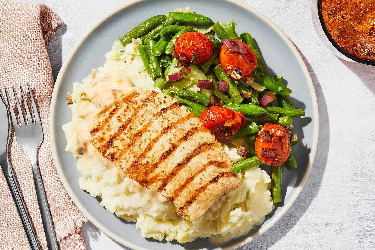 A bed of sour cream and chive mashed potatoes lays the foundation for tender grilled chicken breast marinated with garlic and herbs. A decadent bacon and smoked cheddar spread blankets the top. On the side, roasted green beans and balsamic-glazed grape tomatoes add brightness and balance.