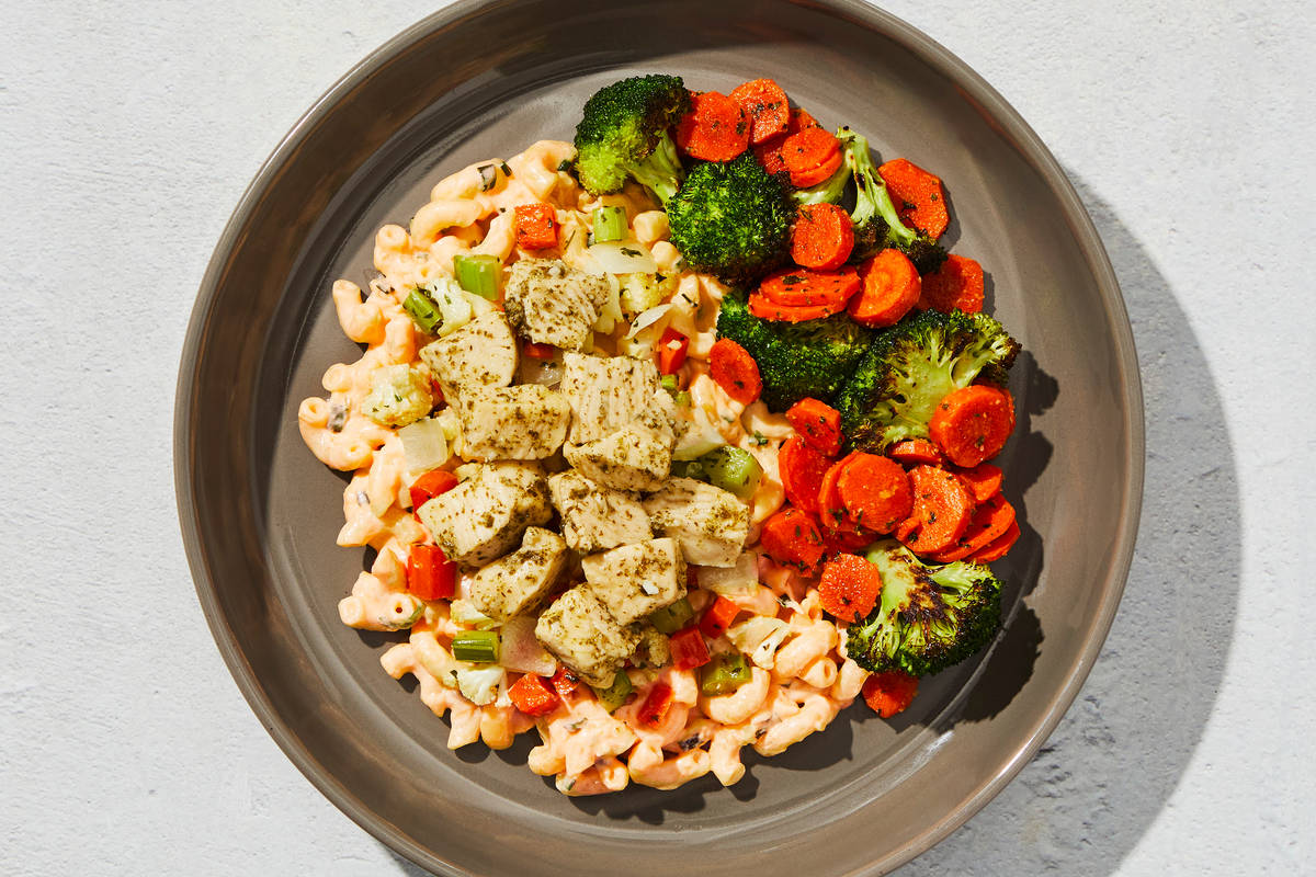 **Ingredients:** Boneless Chicken Breast With Rib Meat, Carrots, Brown Rice Elbow Macaroni (Water, Brown Rice Flour, Potato Starch, Tapioca Starch, Whole Egg, Egg White, Xanthan Gum, Salt), Broccoli, Whole Milk (Pasteurized Milk, Vitamin D3), Onions, Shredded White Cheddar Cheese (Pasteurized Milk, Cheese Cultures, Salt, Enzymes, Anti-Caking Agents (Potato Starch, Powdered Cellulose, Natamycin (A Natural Mold Inhibitor))), Cauliflower, Neufchatel Cheese (Pasteurized Milk And Cream, Skim Milk, Cheese Culture, Salt, Guar Gum, Carob Bean Gum, Xanthan Gum), Celery, Olive Pomace Oil (Refined Olive Pomace Oil, Extra Virgin Olive Oil), Cayenne Pepper Sauce (Aged Cayenne Red Peppers, Distilled Vinegar, Water, Salt, Garlic Powder), Water, Heavy Cream (Heavy Cream, Milk, Gellan Gum, Sunflower Lecithin), Shredded Smoked Gouda Cheese (Pasteurized Milk, Water, Cheese Cultures, Skim Milk, Salt, Enzymes, Sodium Phosphate, Calcium Propionate (Preservative), Apocarotenal (For Color)), Powdered Cellulose (To Prevent Caking), Natamycin (A Natural Mold Inhibitor)), Vinegar, Garlic, Red Wine Vinegar (Diluted With Water To 5% Acidity), Sea Salt, Dried Chives, Granulated Garlic, Dried Parsley, Applewood Smoked Salt (Salt, Contains 2% Or Less Of Smoke Flavor), Granulated Onion, Toasted Garlic Powder, Black Pepper, Granulated Green Onion, Toasted Garlic, Smoked Black Pepper (Pepper, Smoke Flavor) The nutrition facts are based off of the recommended serving size. Serving Size = nan (394g)