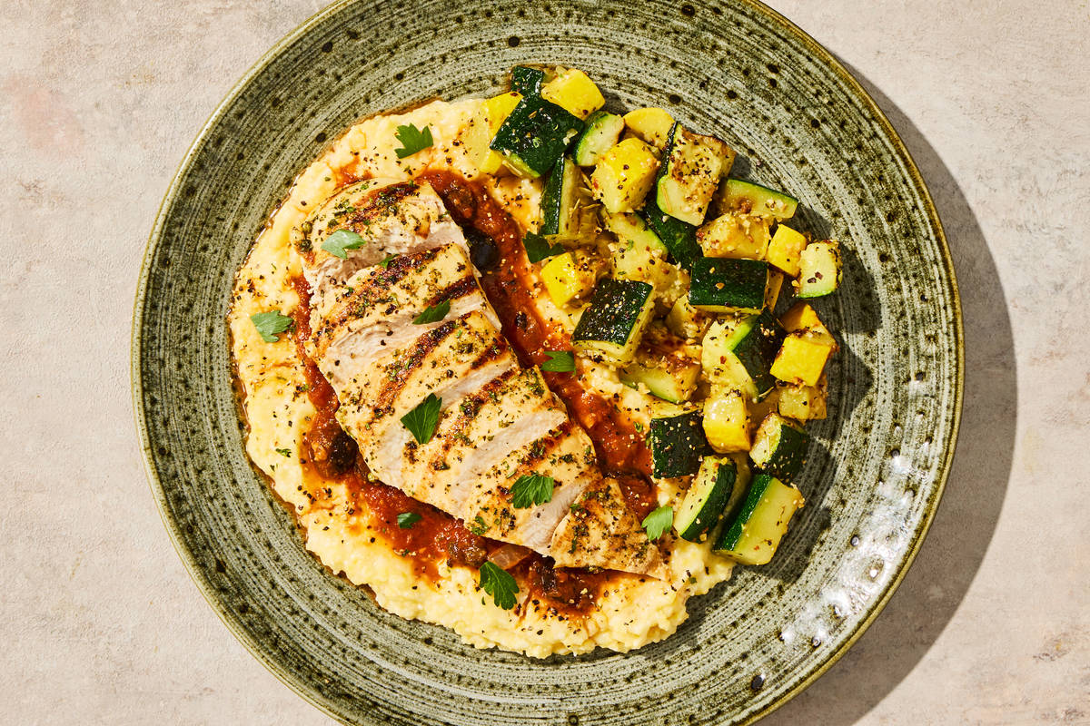 **Ingredients:** Boneless Chicken Breast With Rib Meat, Zucchini, Water, Crushed Tomatoes (Tomatoes, Tomato Puree, Salt, Ascorbic Acid, Citric Acid), Yellow Squash, Enriched Yellow Cornmeal (Yellow Corn Meal, Niacin, Iron, Thiamin, Mononitrate, Riboflavin, Folic Acid), Neufchatel Cheese (Pasteurized Milk And Cream, Skim Milk, Cheese Culture, Salt, Guar Gum, Carob Bean Gum, Xanthan Gum), Olive Pomace Oil (Refined Olive Pomace Oil, Extra Virgin Olive Oil), Onions, Grated Parmesan Cheese (Imported Parmesan Cheese (Pasteurized Cow'S Milk, Cheese Culture, Salt, Enzymes), Water, Milk Protein, Palm Oil Blend, Disodium Phosphate, Citric Acid, Xanthan Gum, Powdered Cellulose (Anti-Caking Agent), Calcium Propionate (Preservative)), Kalamata Olives (Olives, Water, Salt, Acidity Regulators (Lactic Acid, Citric Acid)), Garlic, Unsalted Butter (Pasteurized Cream, Natural Flavorings), Vinegar, Red Wine Vinegar (Diluted With Water To 5% Acidity), Toasted Garlic, Basil, Capers (Capers, Water, Salt, Vinegar), Sea Salt, Fish Sauce (Anchovy, Sea Salt), Toasted Garlic Powder, Granulated Onion, Smoked Black Pepper (Pepper, Smoke Flavor), Dried Oregano, Rosemary, Ground Fennel, Dried Thyme, Dried Dill, Dried Rosemary, Lemon Powder (Citric Acid, Natural Lemon Flavor), Crushed Red Pepper Flakes, Gochugaru Chile Flakes The nutrition facts are based off of the recommended serving size. Serving Size = 1 Tray (369g)