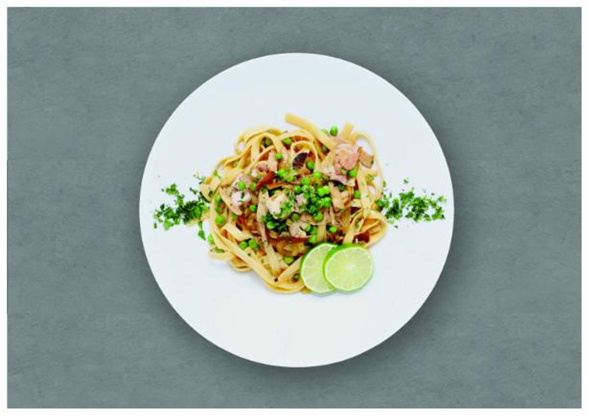 undefinedundefined protein A healthier take on fettuccine alfredo, mixing chicken, sweet edamame and earthy cremini mushrooms.