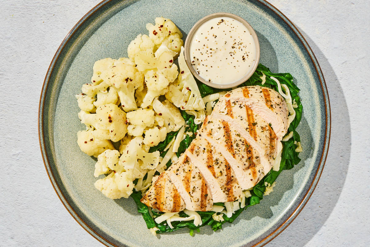 This decadent meal doesn’t hold back on cream, cheese, or deliciousness. To make it, we nestle perfectly baked chicken in a cream sauce bolstered by spinach, shallots, white wine, and Parmesan, then top it all with rich, melty mozzarella. On the side are savory chili-garlic roasted cauliflower florets. **Ingredients:** Boneless Chicken Breast With Rib Meat, Cauliflower, Heavy Cream (Heavy Cream, Milk, Gellan Gum, Sunflower Lecithin), Spinach, Olive Pomace Oil (Refined Olive Pomace Oil, Extra Virgin Olive Oil), Cream Cheese (Pasteurized Milk And Cream, Salt, Cheese Culture, Stabilizers (Xanthan Gum, Carob Bean Gum, Guar Gum)), Whole Milk (Pasteurized Milk, Vitamin D3), Shredded Low Moisture Mozzarella Cheese (Pasteurized Milk, Cheese Cultures, Salt, Enzymes, Anti-Caking Agents (Potato Starch, Powdered Cellulose) Natamycin (A Natural Mold Inhibitor)), Garlic, Grated Parmesan Cheese (Imported Parmesan Cheese (Pasteurized Cow'S Milk, Cheese Culture, Salt, Enzymes), Water, Milk Protein, Palm Oil Blend, Disodium Phosphate, Citric Acid, Xanthan Gum, Powdered Cellulose (Anti-Caking Agent), Calcium Propionate (Preservative)), Water, Onions, Chardonnay Wine (Grapes, Sulfites), Vinegar, Lemon Juice, Sea Salt, Red Wine Vinegar (Diluted With Water To 5% Acidity), Unsalted Butter (Pasteurized Cream, Natural Flavorings), Brown Chicken Stock (Chicken Stock, Mirepoix Stock (Made Of Carrot, Celery And Onion Stocks), Salt, Gelatin, White Wine), Toasted Onion Powder, Smoked Black Pepper (Pepper, Smoke Flavor), Gochugaru Chile Flakes, Granulated Onion, Italian Seasoning (Garlic, Oregano, Basil, Black Pepper, Parsley, Rosemary, Marjoram, Thyme, Savory, Sage), Black Pepper The nutrition facts are based off of the recommended serving size. Serving Size = 1 Tray (343g)