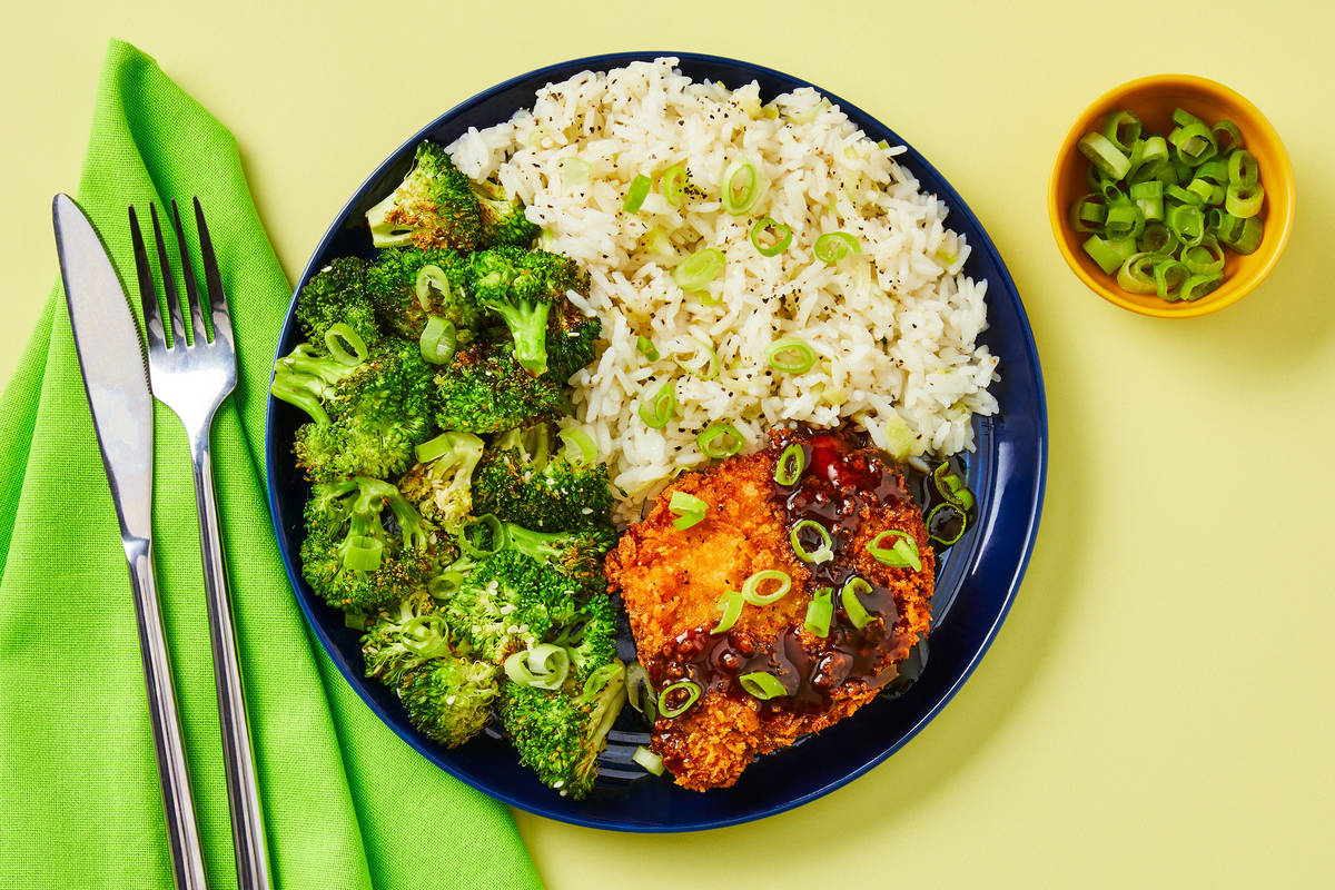 • Place katsu sauce in a small microwave-safe bowl; microwave until warmed through, 30 seconds. • Fluff rice with a fork; stir in 1 TBSP butter (2 TBSP for 4 servings) and season with salt and pepper. • Divide rice, pork, and broccoli between plates. Drizzle pork with katsu sauce. Sprinkle with scallion greens and serve.