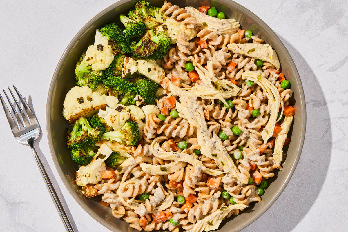 Savor all of the classic and comforting flavors of chicken pot pie with an added twist: red lentil pasta. The curly fusilli is topped with shredded chicken, peas, and carrots, then draped with a silky cream sauce made with celery, onion, white wine, thyme, rosemary, and black pepper. Broccoli and cauliflower florets with garlic and chives make a flavorful side.