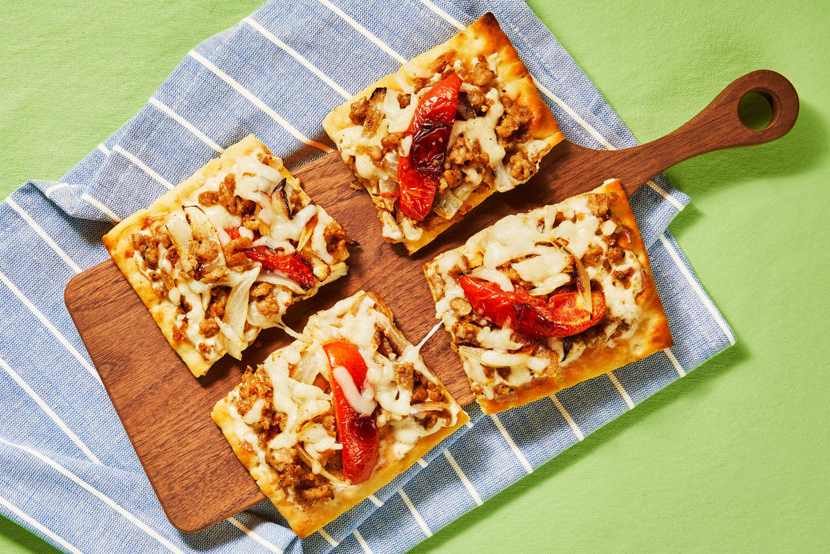 • Heat broiler to high. Evenly spread flatbreads with sauce, then top with sausage, tomato, and as much onion as you like. Sprinkle with mozzarella. • Broil flatbreads until cheese melts, 1-2 minutes. (For 4 servings, broil in batches.) TIP: Watch carefully to avoid burning. • Cut flatbreads into pieces, divide between plates, and serve.