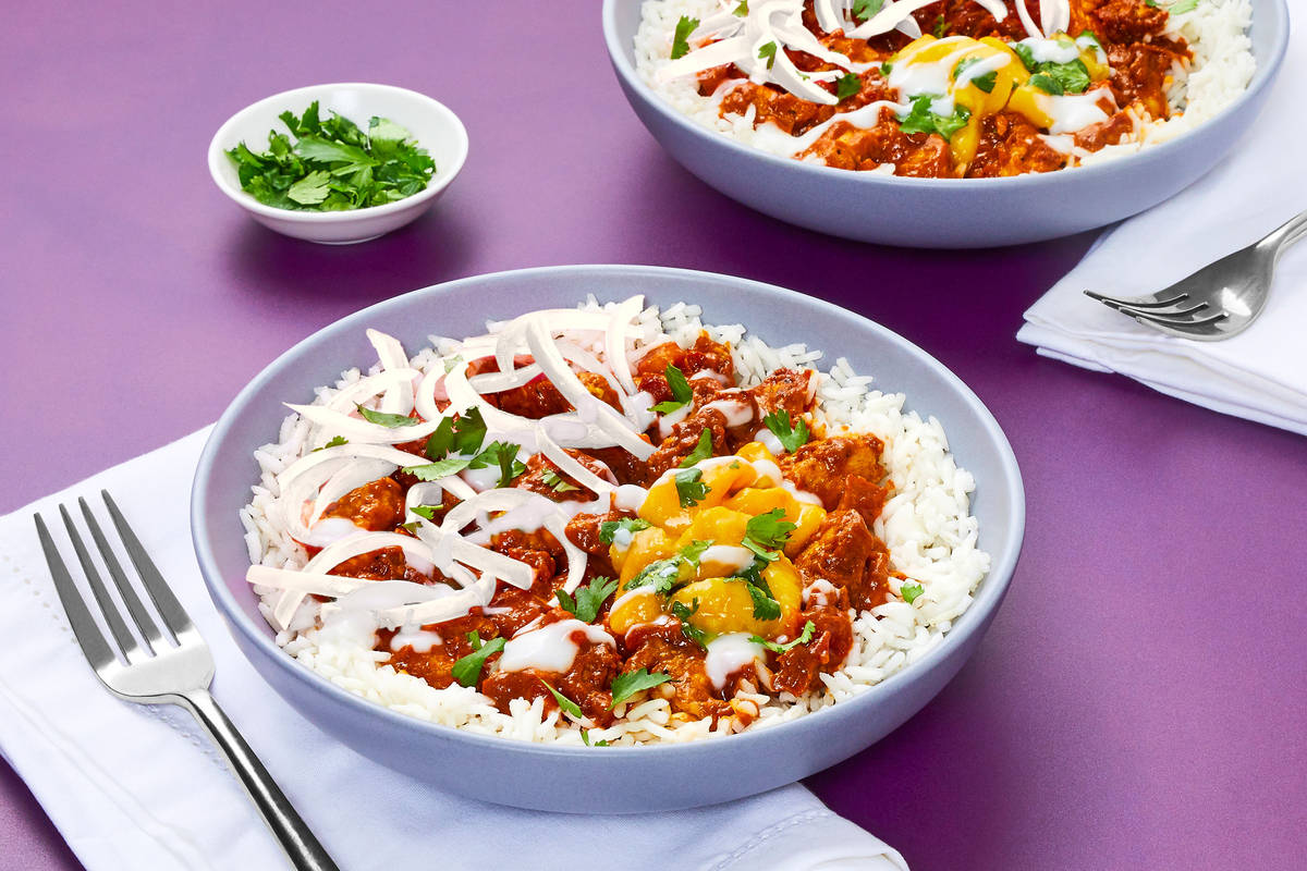 Talk about curry in a hurry! Our streamlined take on chicken tikka masala comes together in 20 minutes—including the basmati rice and a brilliant microwave hack for homemade mango chutney. How is this all possible? Our chefs chose flavor bomb ingredients that build layers of complexity in a short amount of time, like the curry powder sprinkled on chicken breast strips so they sear with a mouthwatering char. The chicken cooks in a tomato curry sauce that amplifies the warming spices. Dijon mustard adds a bracing kick to the quick mango cilantro chutney, which is dolloped over the bowl. Pickled onion, yogurt, and more cilantro complete the toppings for a meal that’s totally bowl-dacious!