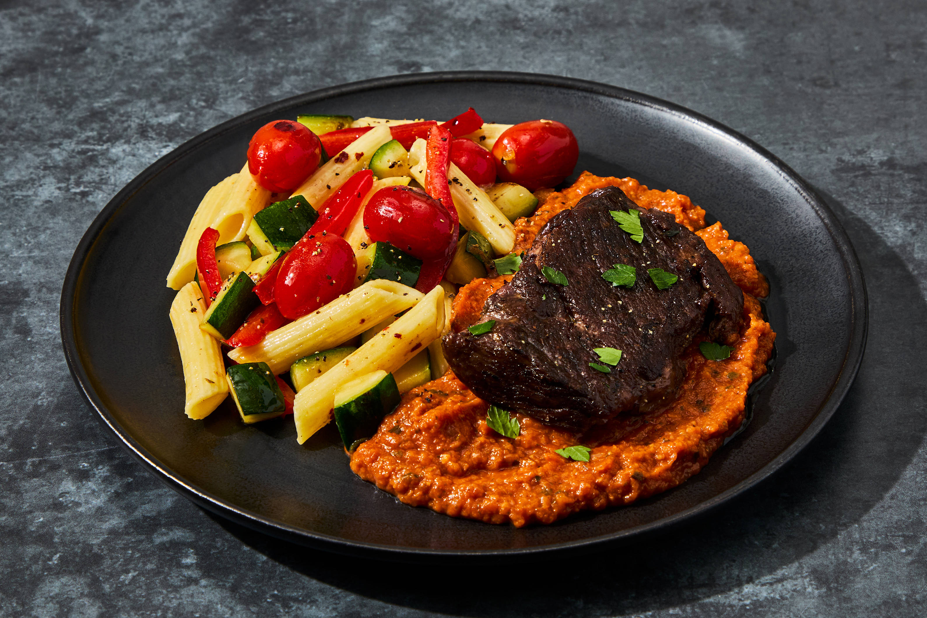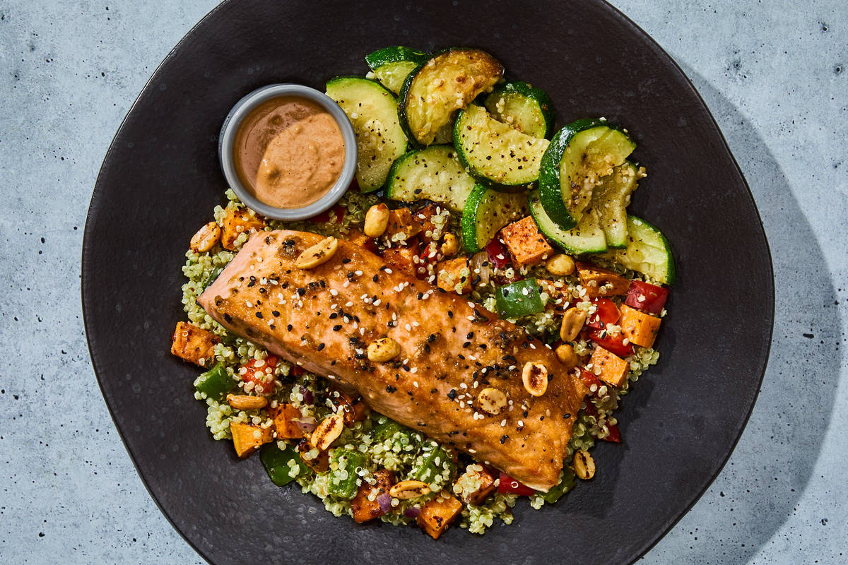 Chili-garlic salmon is served over cilantro quinoa with roasted sweet potatoes and bell peppers. It’s topped with a savory-sweet peanut sauce and crunchy, citrus-roasted peanuts. Served on the side is roasted zucchini with toasted garlic. Ingredients: Atlantic Salmon (Salmon, Color Added Via Feed (Astaxanthin)), Zucchini, Water, Quinoa, Sweet Potatoes (Sweet Potatoes, Sodium Metabisulfite (Added To Maintain Color)), Peanut Butter, Green Bell Peppers, Garlic, Lime Juice (Water, Lime Juice From Concentrate), Olive Pomace Oil (Refined Olive Pomace Oil, Extra Virgin Olive Oil), Blue Agave Nectar, Red Onions, Red Bell Peppers, Peanuts, Ginger, Coconut Aminos (Coconut Nectar, Coconut Blossom Sap, Sea Salt), Cilantro, Tamari (Water, Soybeans, Salt, Alcohol (To Preserve Freshness), Lactic Acid, Rice Vinegar), Toasted Sesame Oil, Mirepoix Concentrate (Vegetable Stock (Carrot, Celery And Onion Stocks), Sea Salt, Carrot Stock, Tapioca Starch, Cabbage Juice Concentrate, Celery Stock, Onion Stock, Natural Flavors, Mushroom Stock, Tomato Paste), Green Onions, Honey, Jalapeño Peppers, Sambal Oelek Chili Paste (Red Chili Peppers, Salt, Distilled Vinegar, Xanthan Gum), Rice Vinegar, Toasted Onion Powder, Lemon Juice, Extra Virgin Coconut Oil, Sea Salt, Granulated Garlic, Dried Onion Flakes, Toasted Garlic, Granulated Green Onion, Roasted Sesame Seeds, Tapioca Starch, Gochugaru Chile Flakes, Granulated Onion, Toasted Garlic Powder, Dried Chives, Shallots, Coriander, Apple Cider Vinegar (Diluted With Water To 5% Acidity), Cumin, White Pepper, Black Sesame Seeds, Smoked Black Pepper (Pepper, Smoke Flavor), Lime Powder (Citric Acid, Natural Lime Flavor), Crushed Red Pepper Flakes The nutrition facts are based off of the recommended serving size. Serving Size = 1 Tray (371g)