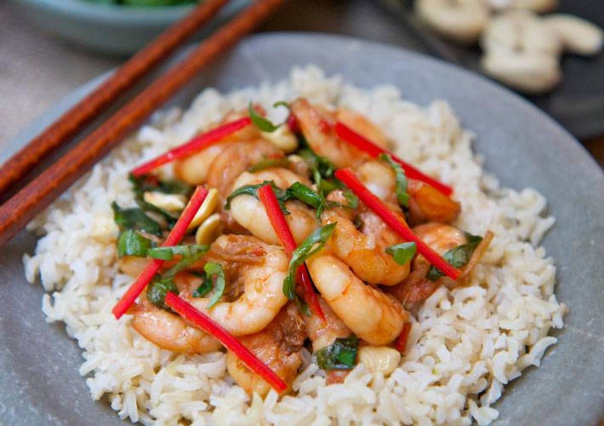 undefinedundefined protein Shrimp takes on the flavors of Asia in a sweet and salty sauce with cashews over nutty brown rice.