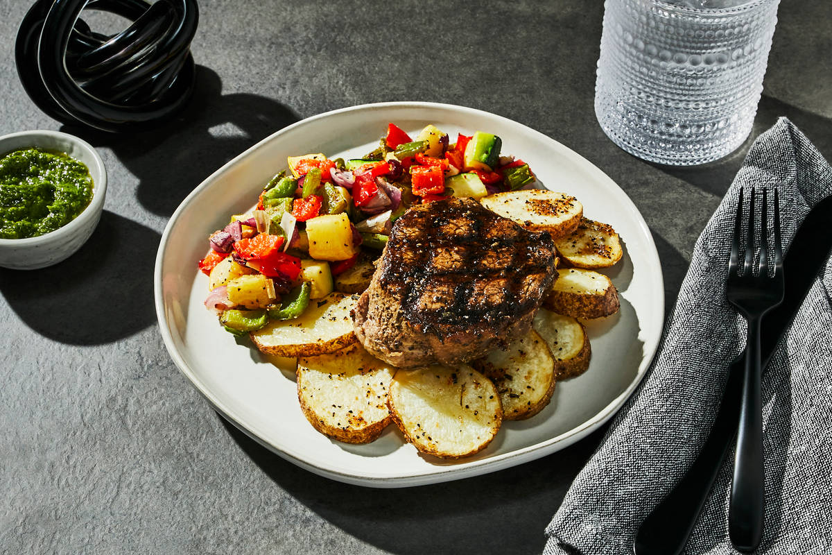 You don’t even need to light your grill to enjoy this Argentinian steakhouse-inspired dish. Beef filet is marinated with peppercorns and herbs, then grilled and served over smoky, sofrito-inspired roasted peppers, onions, and squash. Rosemary and thyme-roasted potatoes round out the dish for that classic steak and potatoes combo. Drizzle everything with herby cilantro chimichurri for a bright, mildly spicy finishing touch. **Ingredients:** Beef Tenderloin, Russet Potatoes (Russet Potatoes, Sodium Metabisulfite (Added To Maintain Color)), Zucchini, Yellow Squash, Red Bell Peppers, Green Bell Peppers, Olive Pomace Oil (Refined Olive Pomace Oil, Extra Virgin Olive Oil), Red Onions, Cilantro, Jalapeño Peppers, Garlic, Water, Onions, Parsley, Vinegar, Apple Cider Vinegar (Diluted With Water To 5% Acidity), Leeks, Sea Salt, Lime Juice (Water, Lime Juice From Concentrate), Granulated Garlic, Granulated Onion, Black Pepper, Green Onions, Rosemary, Thyme, Lime Powder (Citric Acid, Natural Lime Flavor), Smoked Black Pepper (Pepper, Smoke Flavor), Lemon Juice The nutrition facts are based off of the recommended serving size. Serving Size = 1 Tray (369g)