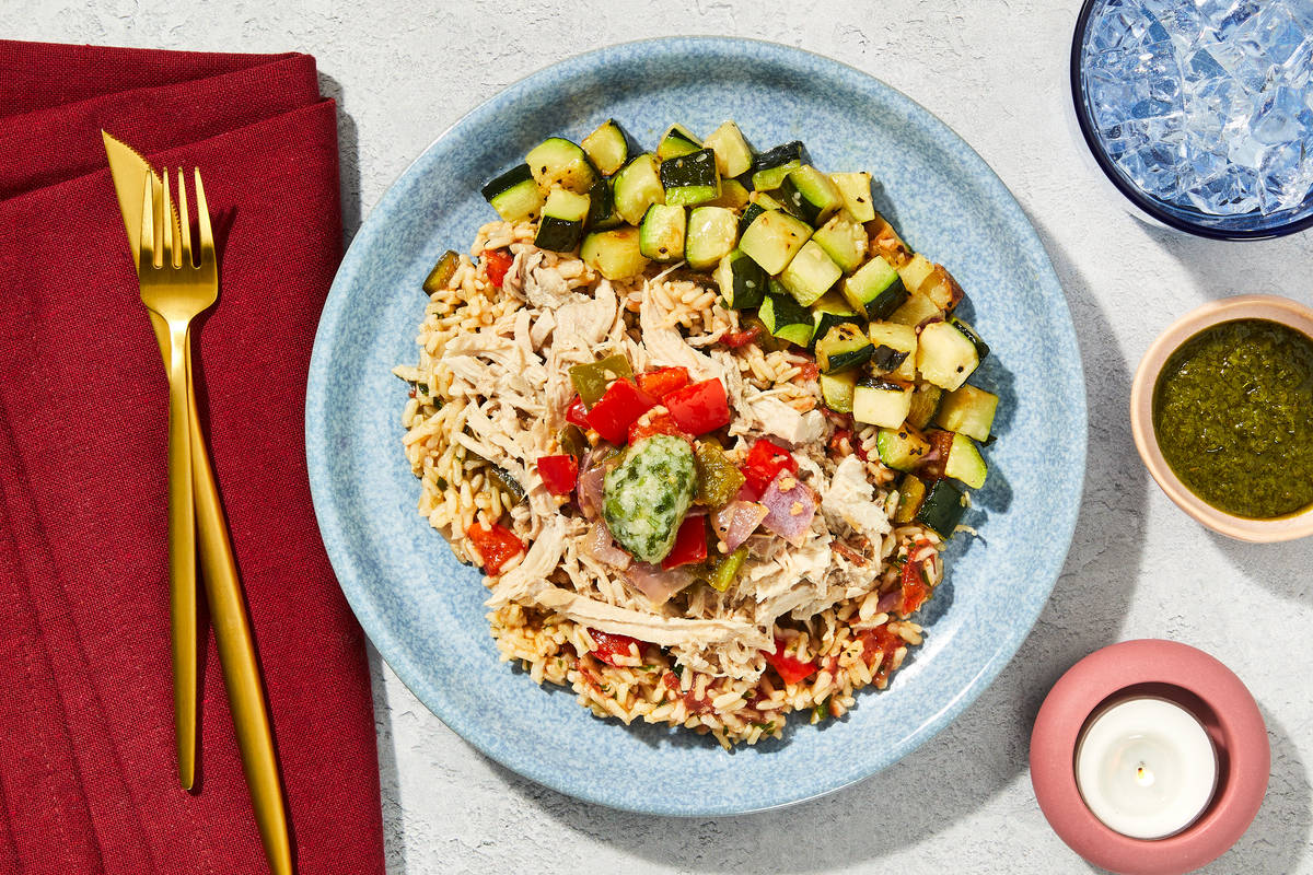 Cooked low and slow, this tender braised pork is shredded over brown rice tossed with our fire roasted tomato salsa. It’s topped with savory-sweet roasted peppers and Parmesan-chive butter and served with toasted garlic zucchini. There’s also a vibrant chimichurri sauce made with cilantro, parsley, and jalapeños, for drizzling as you like. **Ingredients:** Sous Vide Pork Shoulder (Pork, Pork Stock, Vinegar, Onion, Garlic, Salt, Yeast Extract, Sea Salt, Rosemary Extract), Zucchini, Water, Long Grain Brown Rice, Red Bell Peppers, Green Bell Peppers, Fire Roasted Tomatoes (Tomatoes, Tomato Juice, Sea Salt, Calcium Chloride, Citric Acid), Olive Pomace Oil (Refined Olive Pomace Oil, Extra Virgin Olive Oil), Red Onions, Cilantro, Unsalted Butter (Pasteurized Cream, Natural Flavorings), Jalapeño Peppers, Garlic, Poblano Peppers, Vinegar, Onions, Parsley, Grated Parmesan Cheese (Imported Parmesan Cheese (Pasteurized Cow'S Milk, Cheese Culture, Salt, Enzymes), Water, Milk Protein, Palm Oil Blend, Disodium Phosphate, Citric Acid, Xanthan Gum, Powdered Cellulose (Anti-Caking Agent), Calcium Propionate (Preservative)), Apple Cider Vinegar (Diluted With Water To 5% Acidity), Brown Chicken Stock (Chicken Stock, Mirepoix Stock (Made Of Carrot, Celery And Onion Stocks), Salt, Gelatin, White Wine), Lime Juice (Water, Lime Juice From Concentrate), Sea Salt, Toasted Garlic, Black Pepper, Granulated Garlic, Granulated Onion, Lime Powder (Citric Acid, Natural Lime Flavor), Dried Parsley, Dried Chives, Cumin, Chili Powder (Chili Pepper, Spices (Including Mustard), Salt, Garlic Powder), Liquid Smoke (Water, Hickory Smoke Concentrate) The nutrition facts are based off of the recommended serving size. Serving Size = 1 Tray (366g)
