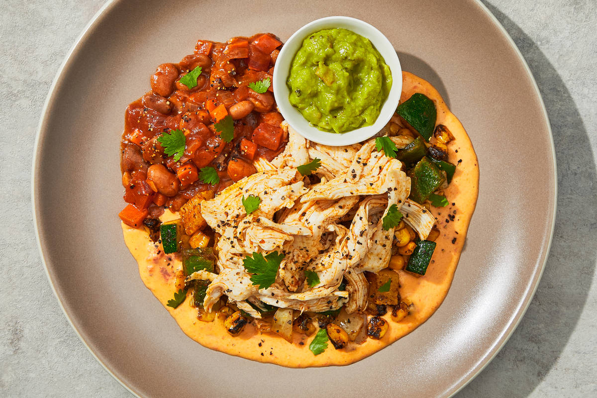 For this Mexican-style gem, smoky, garlicky bites of chicken breast are doused with an irresistible cheddar queso sauce spiced with smoky chipotle chiles. It’s served over a Mexican-spiced trio of peppers, zucchini, and charred corn. On the side, you’ll find hearty pinto beans simmered with carrots, onions, and tomatoes plus creamy guacamole for dolloping.