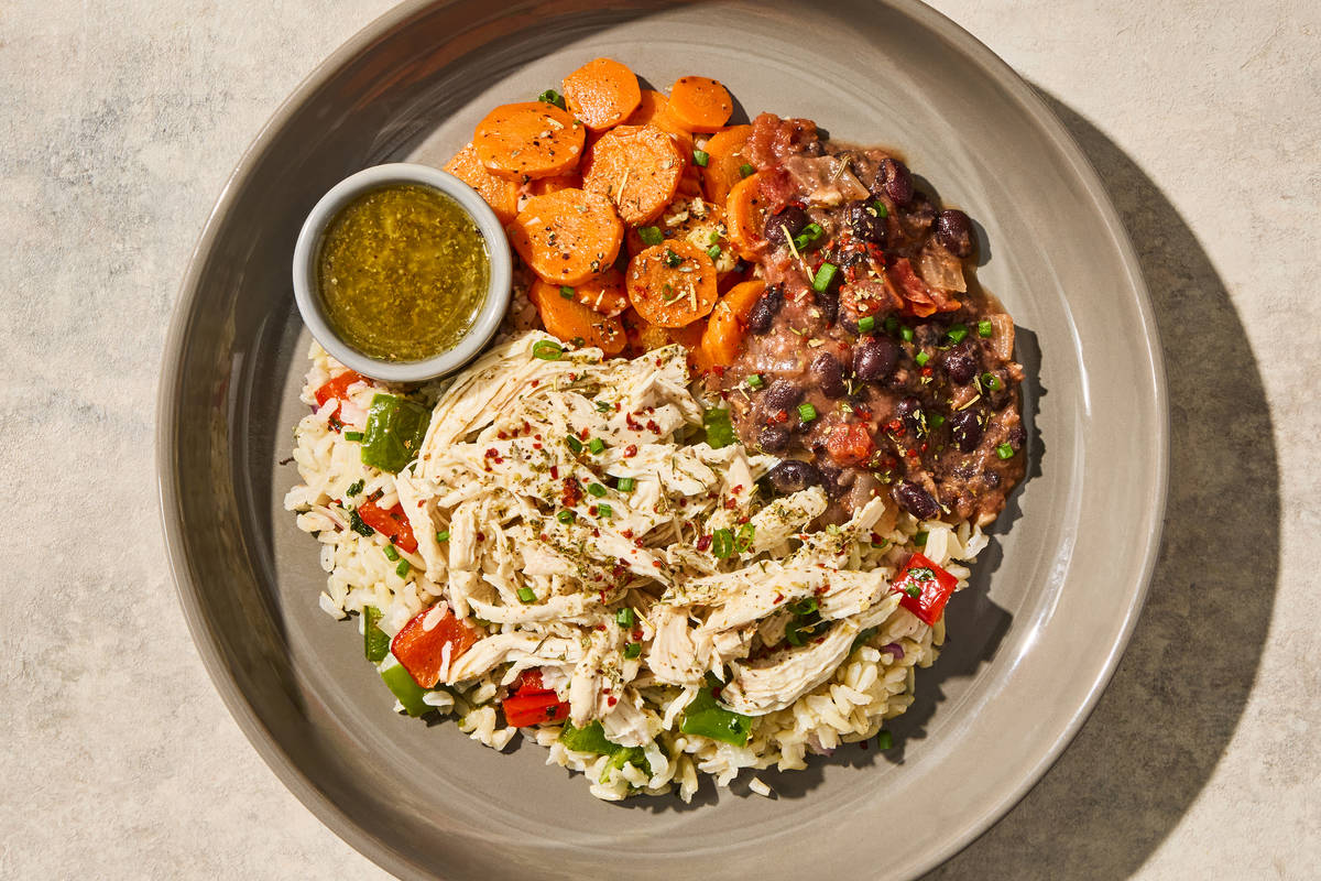 The magic is in the mojo! That’s the Cuban-style sauce with citrusy notes that makes this dish so special. Tender shredded chicken sits atop coconut-scented brown rice and is garnished with a colorful mix of roasted bell peppers. Drizzle on a bright mojo sauce featuring lime and orange juices, cilantro, and spices. On the side are stewed black beans infused with onion, lime, and oregano, and garlicky carrot coins seasoned with cilantro. **Ingredients:** Boneless Chicken Breast With Rib Meat, Carrots, Black Beans (Prepared Black Beans, Water, Salt, And Calcium Chloride (Firming Agent)), Water, Green Bell Peppers, Olive Pomace Oil (Refined Olive Pomace Oil, Extra Virgin Olive Oil), Coconut Milk (Coconut, Water, Guar Gum, Coconut Milk And Water, Coconut Cream, Contains 1% Or Less Of: Coconut Water Concentrate, Gellan Gum, Natural Flavor, Sodium Citrate, Tricalcium Phosphate, Vitamin D2, Xanthan Gum), Fire Roasted Tomatoes (Tomatoes, Tomato Juice, Sea Salt, Calcium Chloride, Citric Acid), Brown Jasmine Rice, Garlic, Red Onions, Red Bell Peppers, Lime Juice (Water, Lime Juice From Concentrate), Orange Juice, Cilantro, Onions, Vinegar, Sea Salt, Honey, Red Wine Vinegar (Diluted With Water To 5% Acidity), Toasted Garlic Powder, Granulated Garlic, Black Pepper, Cumin, Dried Parsley, Ground Kaffir Lime Leaves, Xanthan Gum, Dried Oregano, Lime Powder (Citric Acid, Natural Lime Flavor), Dried Chives The nutrition facts are based off of the recommended serving size. Serving Size = 1 Tray (369g)