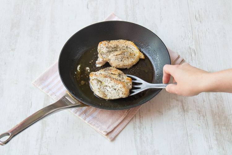 Butterfly the chicken: place your hand on top of the chicken breast, and slice into the center of the meat, parallel to the cutting board, until almost through. Open the chicken up like a book. Repeat with remaining chicken breast.
