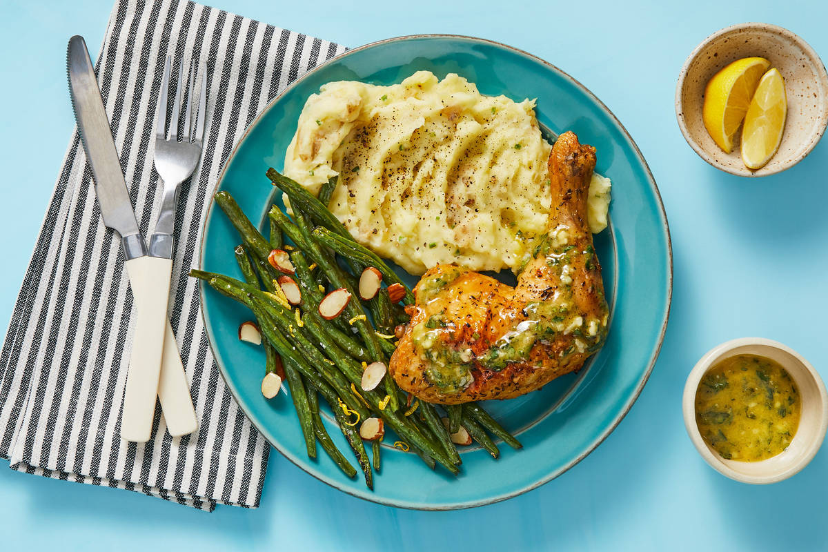 When it comes to chicken, we’re always looking for two things: golden crackly skin and juicy, flavorful meat. Enter: these French-style roasted chicken legs. They’re all that and then some—the “some” being floral Herbes de Provence and a tangy mustard dressing that really takes ’em above and beyond. They’re served alongside almond-flecked green beans and chive mashed potatoes so you can...get a LEG up on dinnertime!