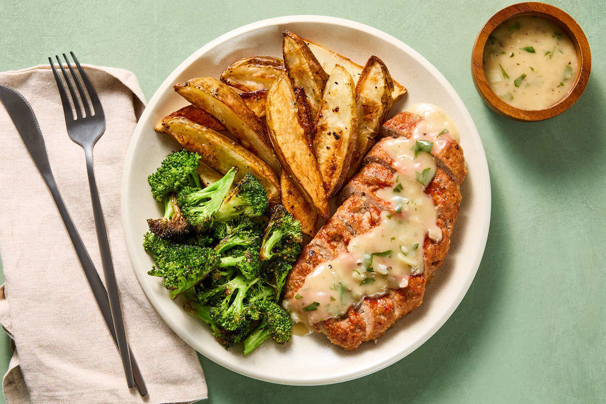 This homestyle turkey meatloaf and gravy is guaranteed to bring comfort food vibes to your table. Garlic, shallot, and parsley pump up the flavor in the meatloaves and gravy, and a quick brush of ketchup makes for a classic savory-sweet glaze. Roasted potato wedges and broccoli round out this blue plate special that’s sure to be gobbled up!