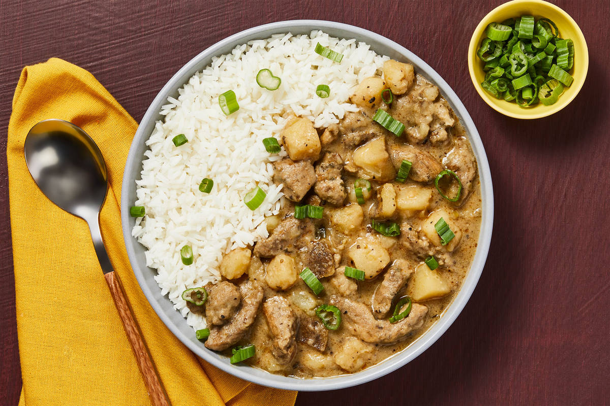 Imagine all the flavors and homey coziness of a chicken pot pie, without the crust. Thanks to a few tricks up our chefs’ sleeves (mirepoix paste! Cheese roux concentrate!), this supremely comforting bowl comes together in just 30 minutes. You’ll start your stew by searing chicken with oregano, garlic, and scallion, then add potatoes and chicken stock. When everything’s cooked through, you’ll whisk up a creamy roux that gives this stew its signature velvety finish. Serve over fluffy rice and garnish with scallion greens for a warming bowl of mm-mmm!