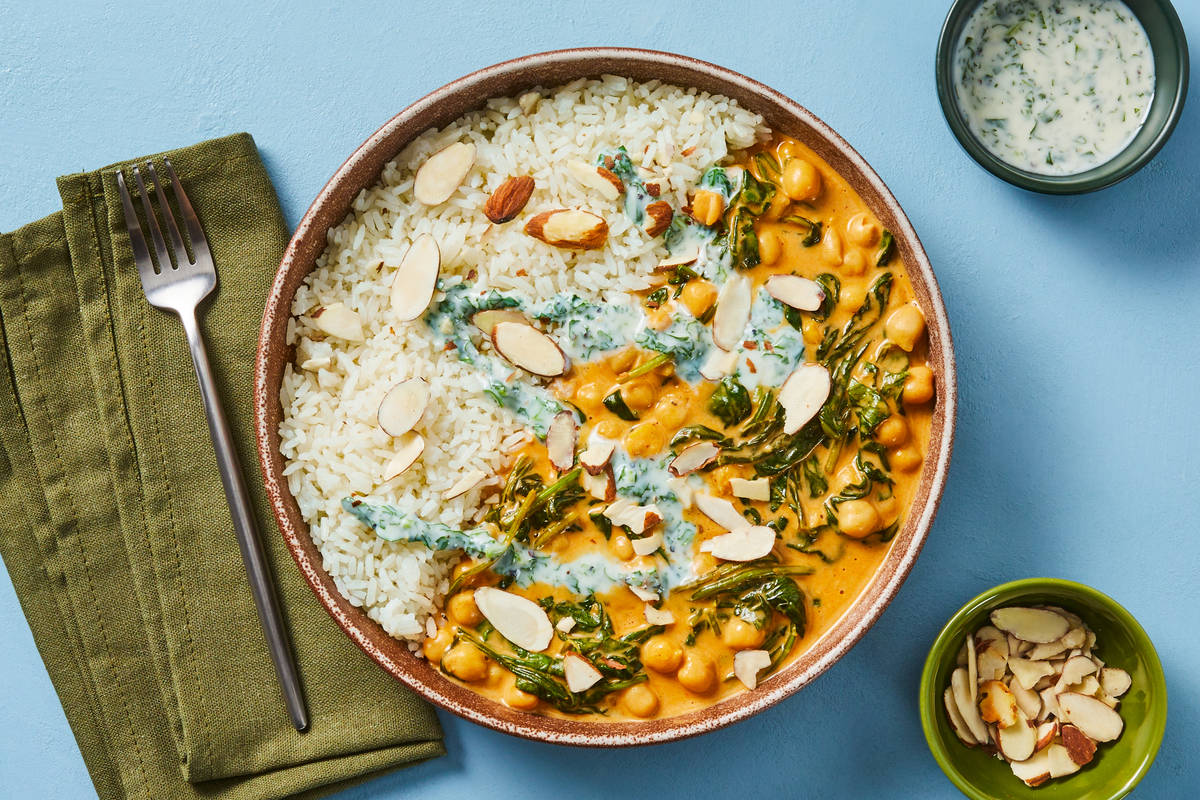 We've got a shortcut to homemade curry that makes this vegetarian dish quick easy to prepare. You'll simmer chickpeas and spinach with our blend of warming curry spices, and serve it all over quick-cooking rice with a drizzle of cooling cilantro-yogurt sauce. A sprinkle of crunchy, nutty almonds makes a perfect finishing touch to this speedy meal.