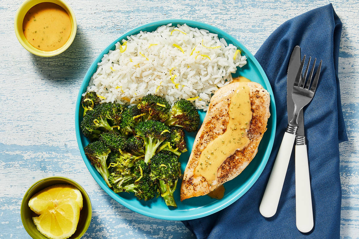We’re big fans of pan sauces because they’re an easy way to add tons of restaurant-level flair to your dish. Here, tangy lemon juice, punchy Dijon, sour cream, and fresh chives mingle to create a condiment that takes seared chicken to the next level. On the side, there’s zesty lemon rice and roasted broccoli—because you only deserve the best!
